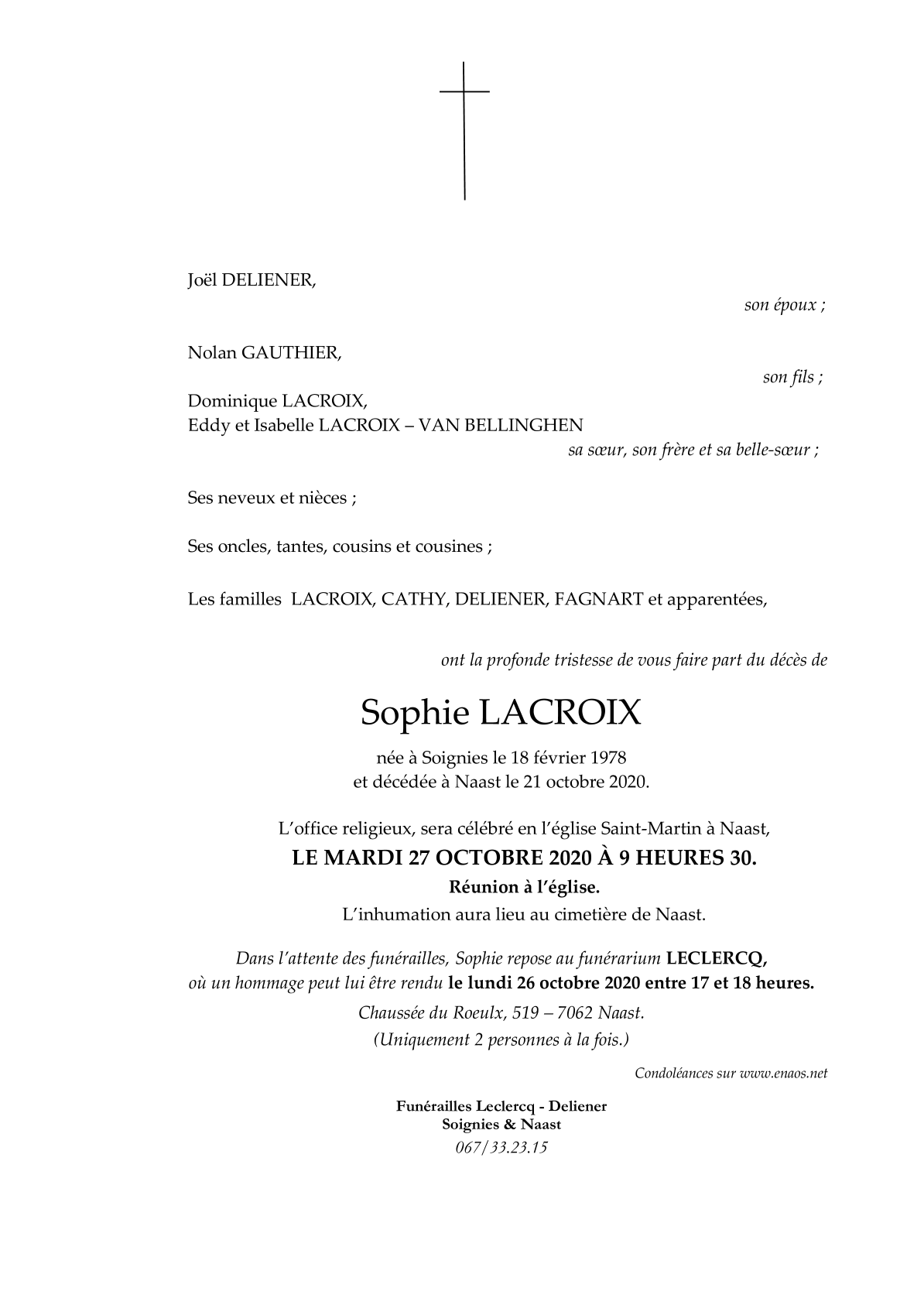 Décédée à Naast (7062) le mercredi 21 octobre 2020 à l'âge de 42 ans