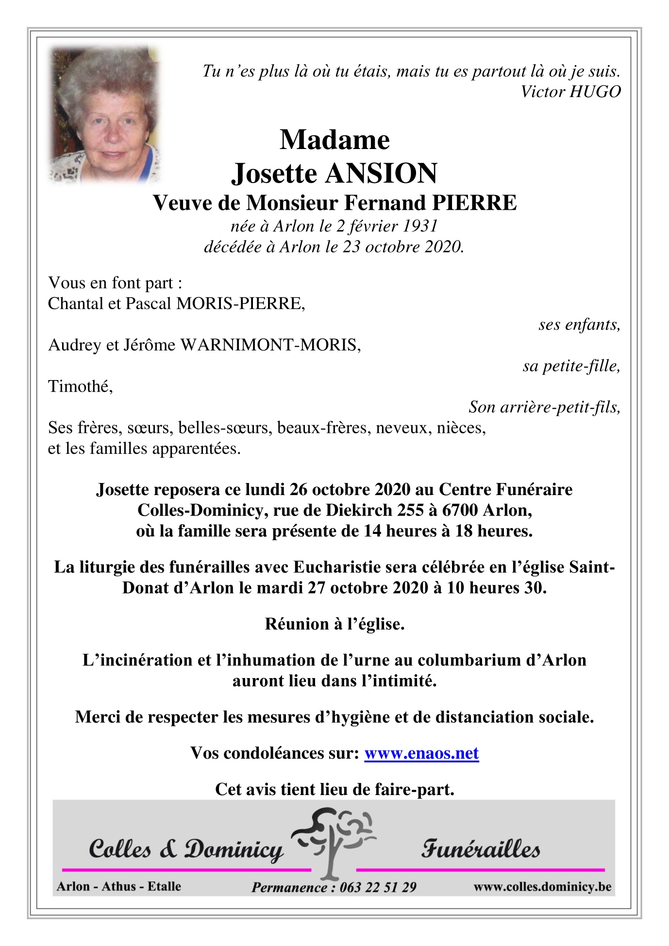 Décédée à Arlon (6700) le vendredi 23 octobre 2020 à l'âge de 89 ans