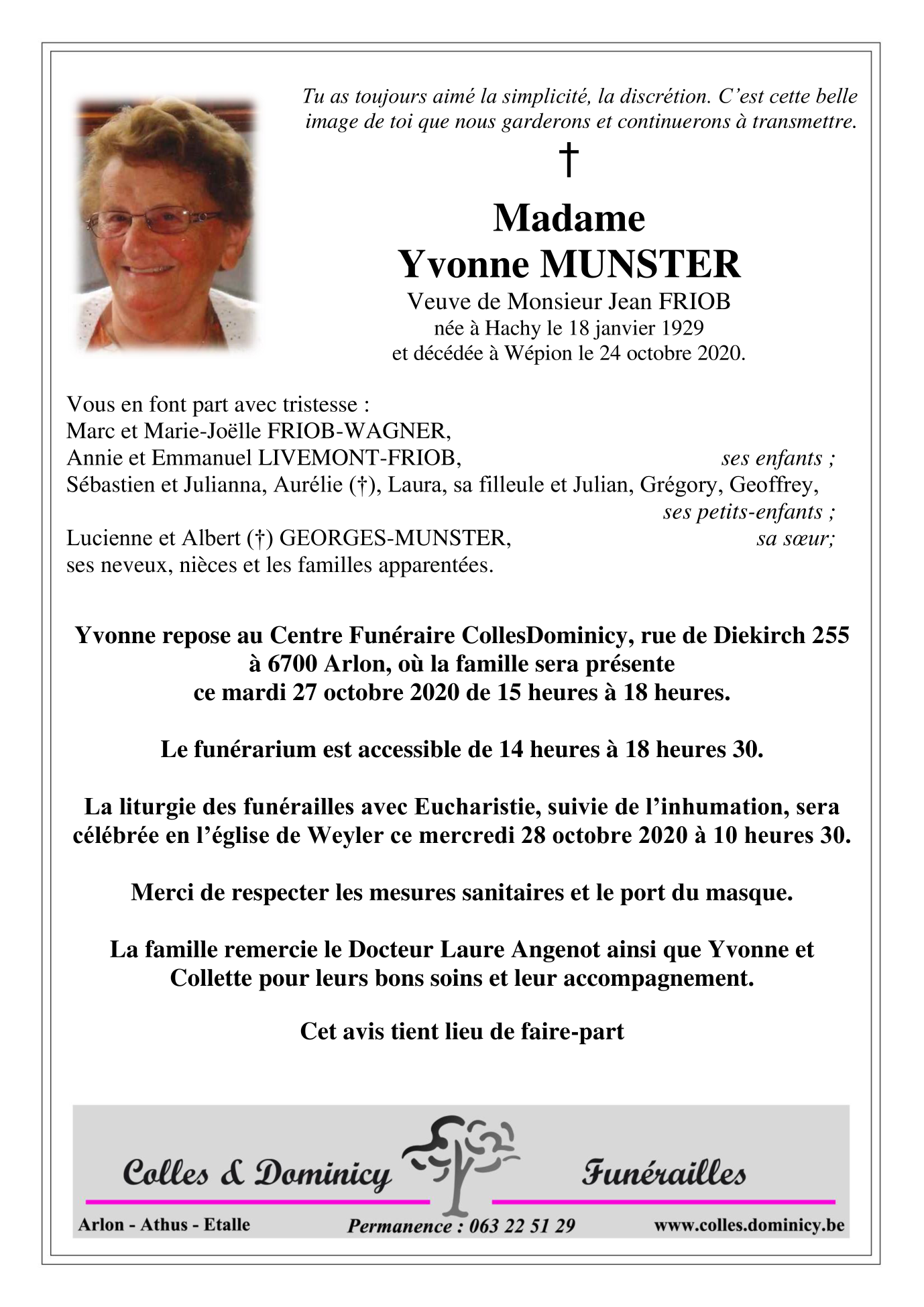 Décédée à Wépion (5100) le samedi 24 octobre 2020 à l'âge de 91 ans