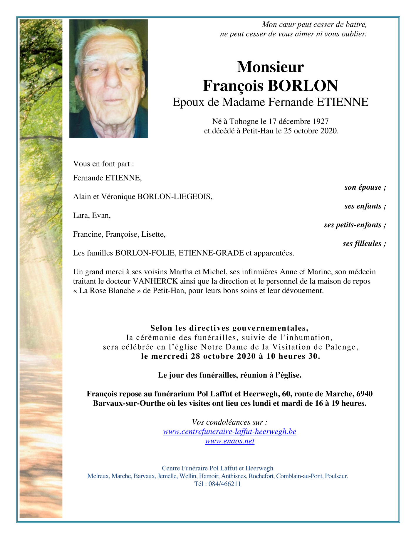 Décédé à Petit-Han (6940) le dimanche 25 octobre 2020 à l'âge de 92 ans