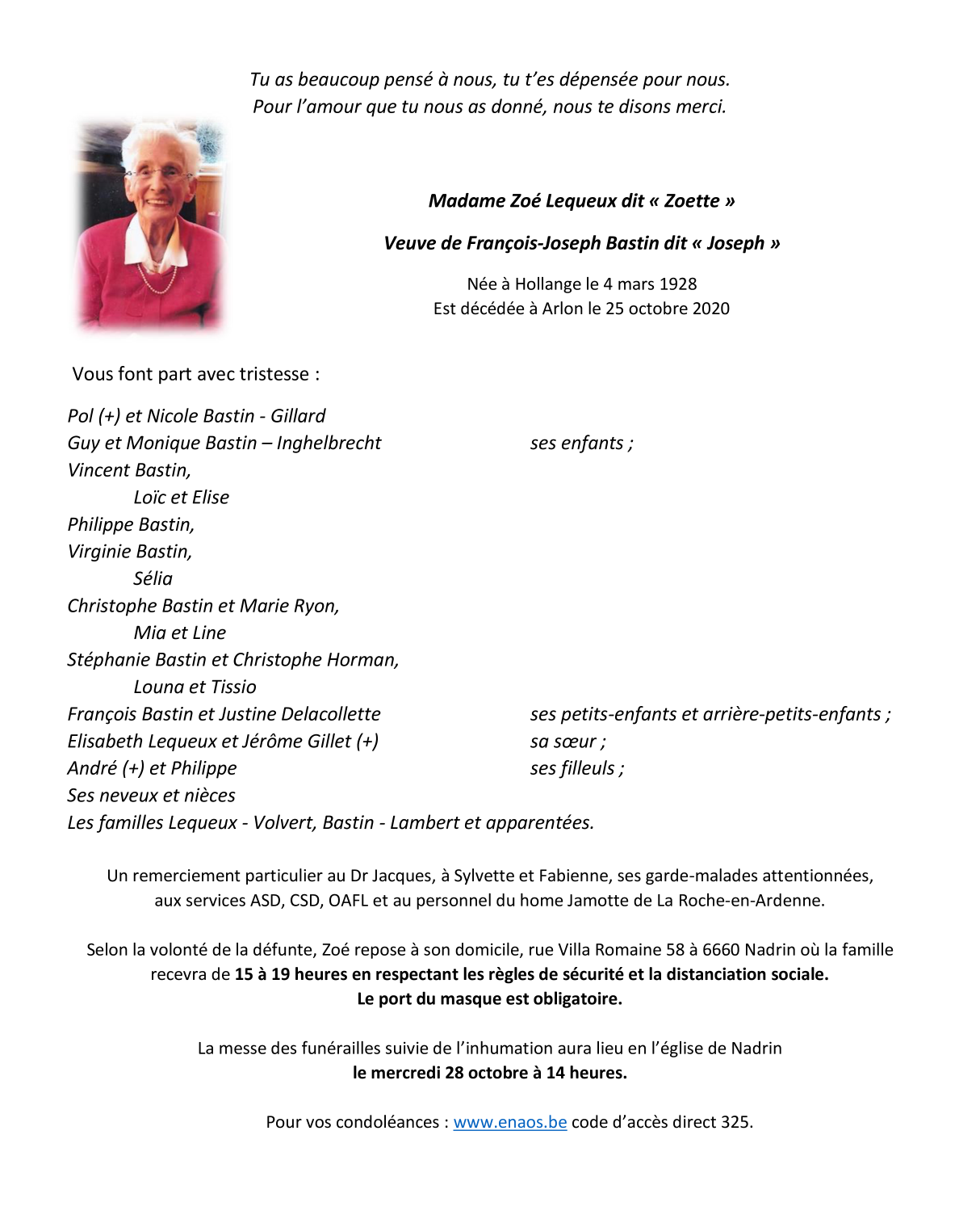 Fallecida en Arlon (6700) el domingo, 25 de octubre de 2020 a la edad de 92 años