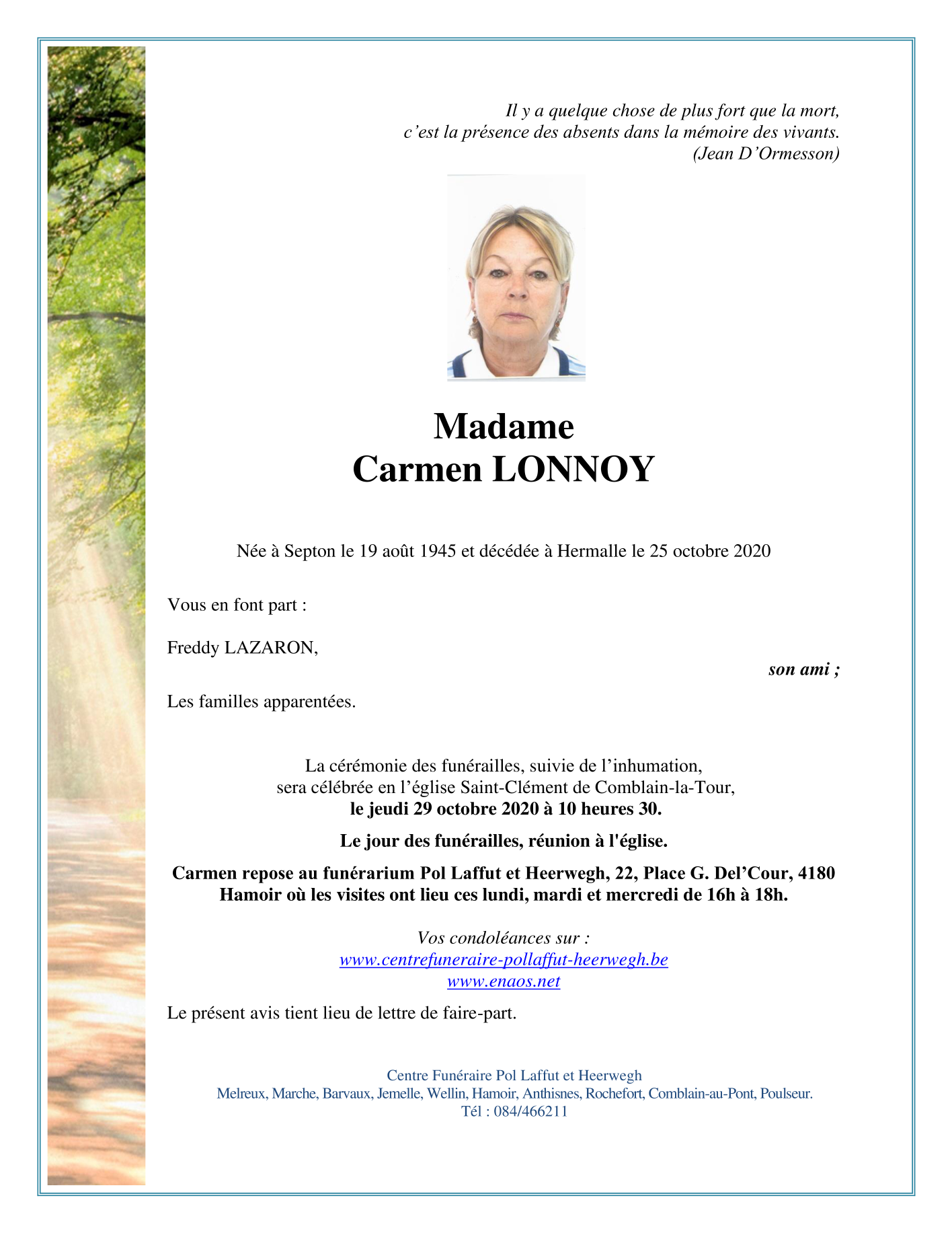 Décédée à Hermalle-sous-Argenteau (4681) le dimanche 25 octobre 2020 à l'âge de 75 ans