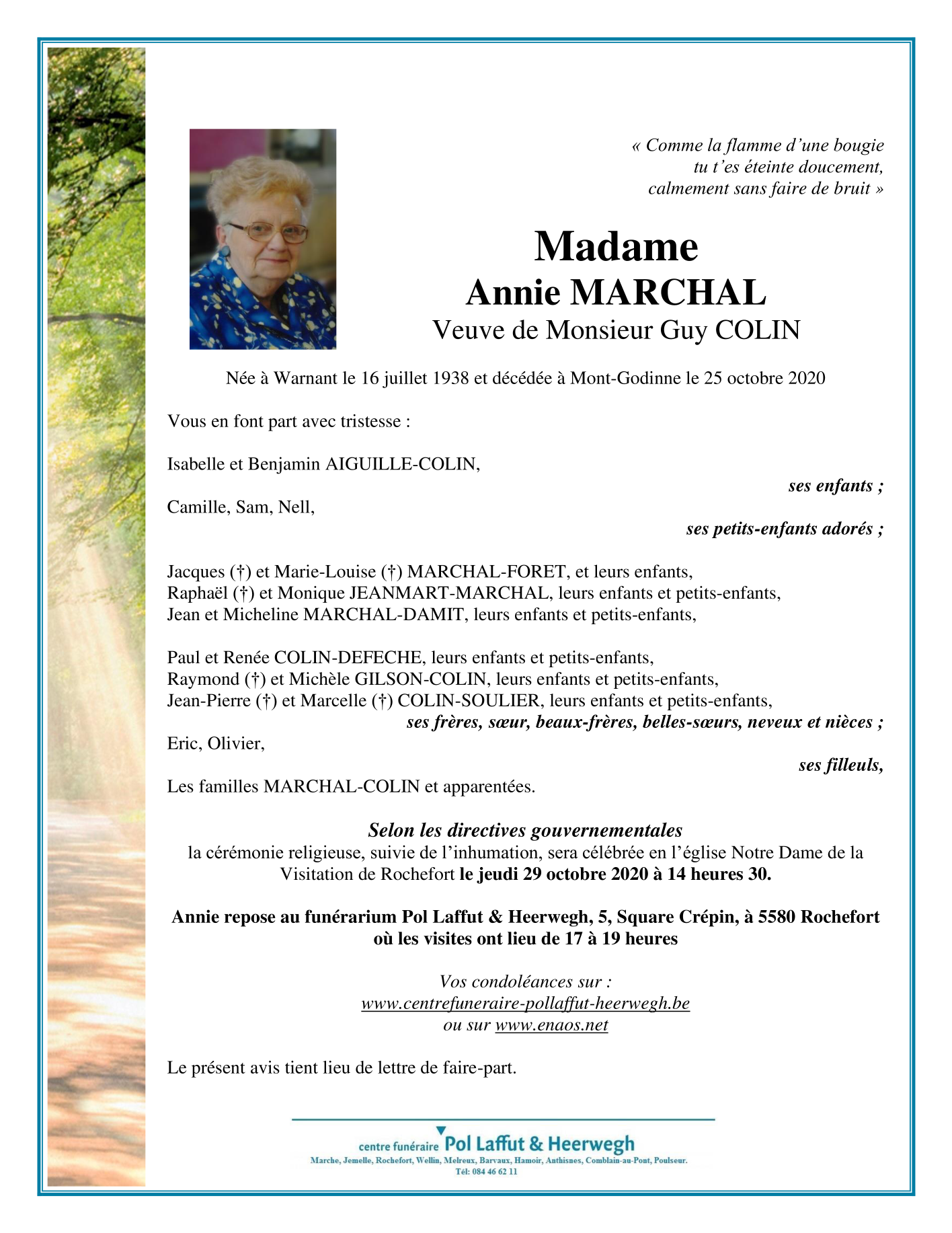 Décédée à Mont-Godinne (5530) le lundi 26 octobre 2020 à l'âge de 82 ans