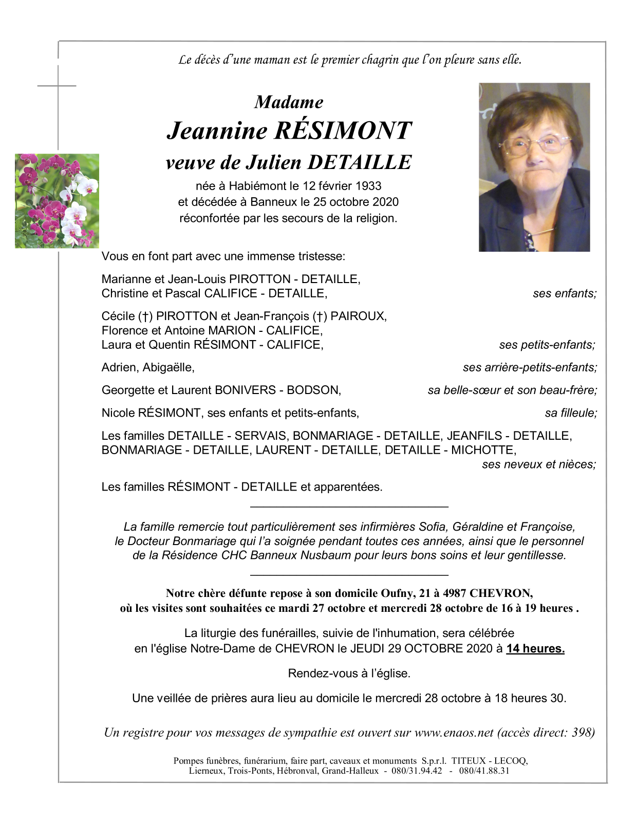 Décédé à Banneux (4141) le dimanche 25 octobre 2020 à l'âge de 87 ans