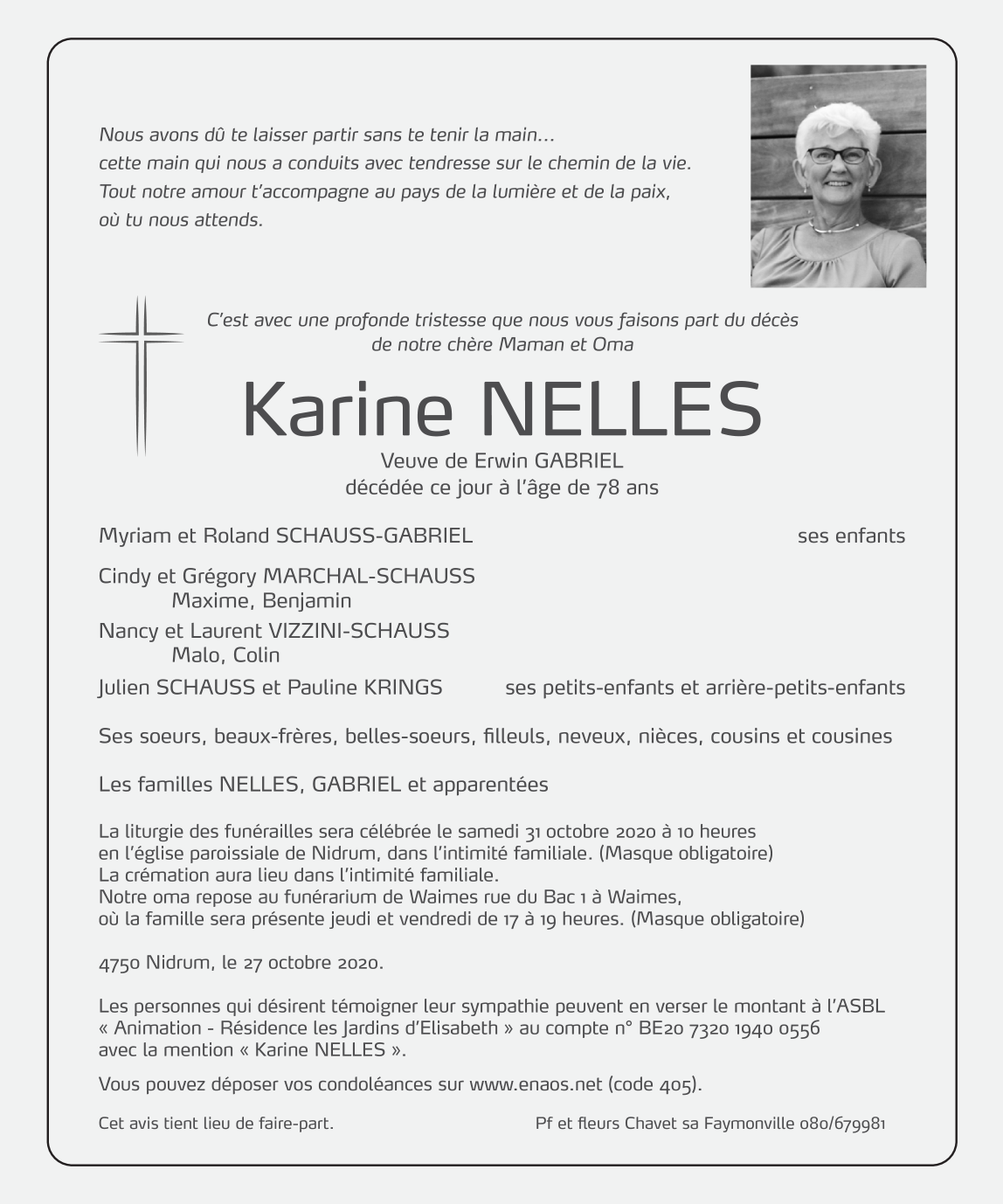 Fallecida en Malmedy (4960) el martes, 27 de octubre de 2020 a la edad de 78 años