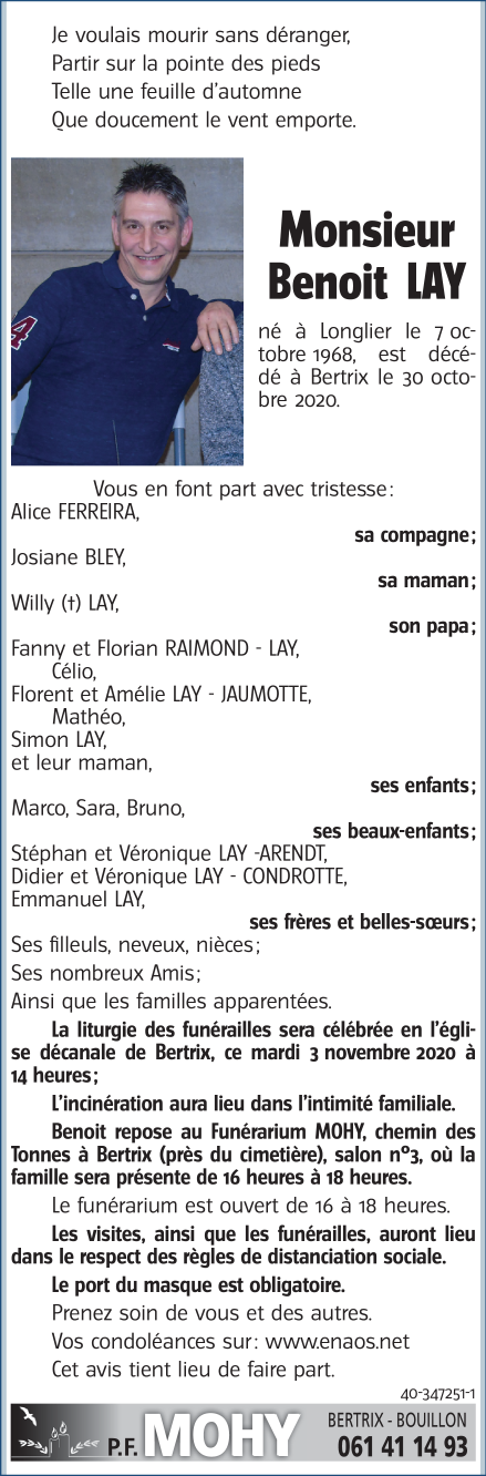 Décédé à Bertrix (6880) le vendredi 30 octobre 2020 à l'âge de 52 ans