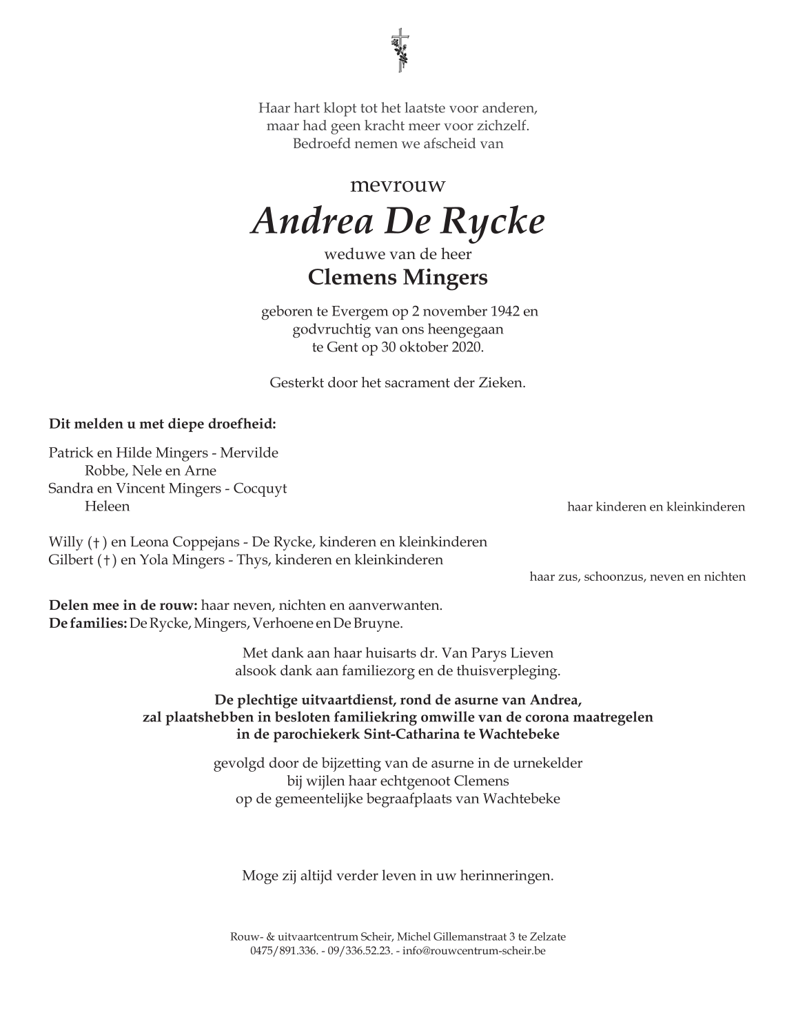 Décédée à Gent (9000) le vendredi 30 octobre 2020 à l'âge de 77 ans