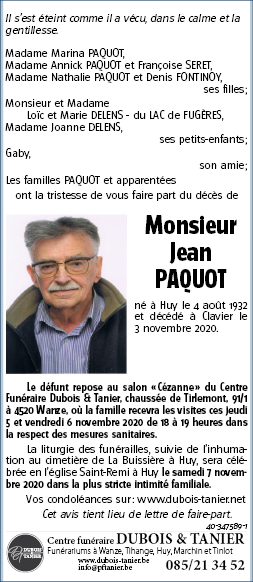 Décédé à Ochain (4560) le mardi 3 novembre 2020 à l'âge de 88 ans