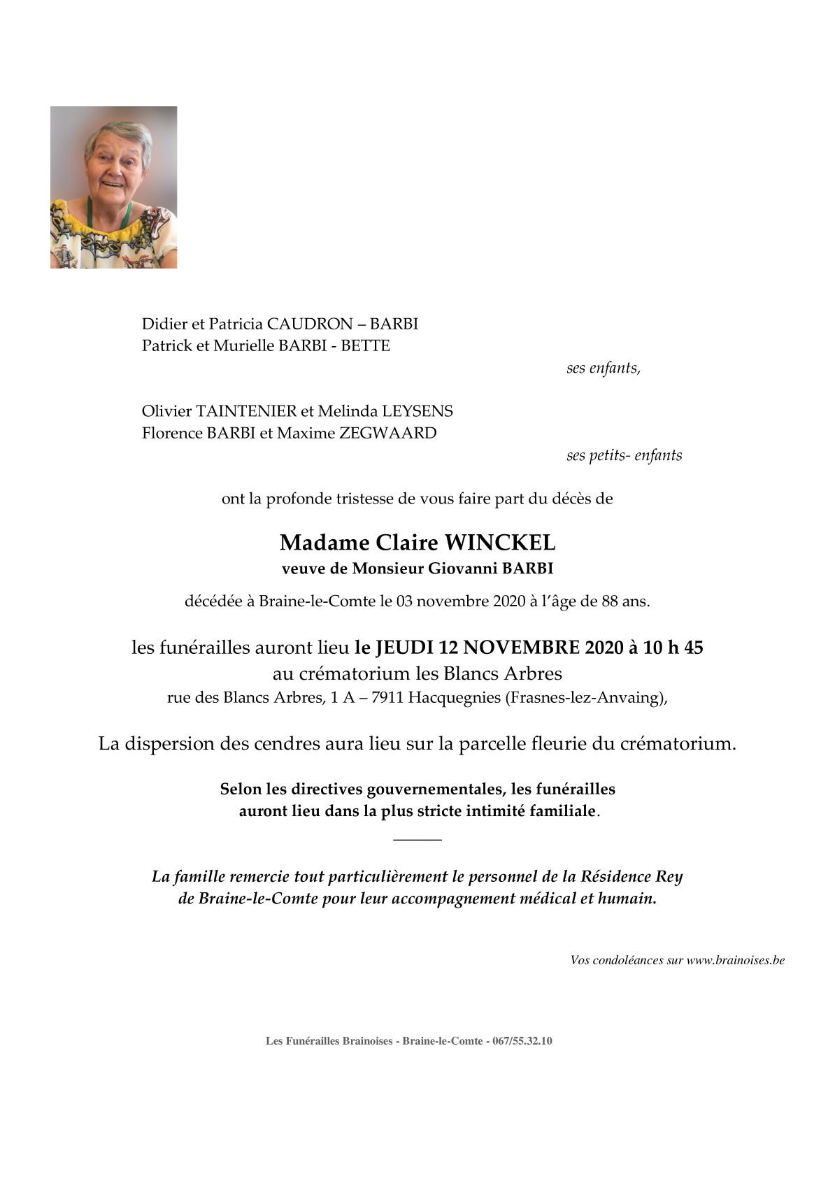 Fallecida en Braine-le-Comte (7090) el martes, 3 de noviembre de 2020 a la edad de 88 años