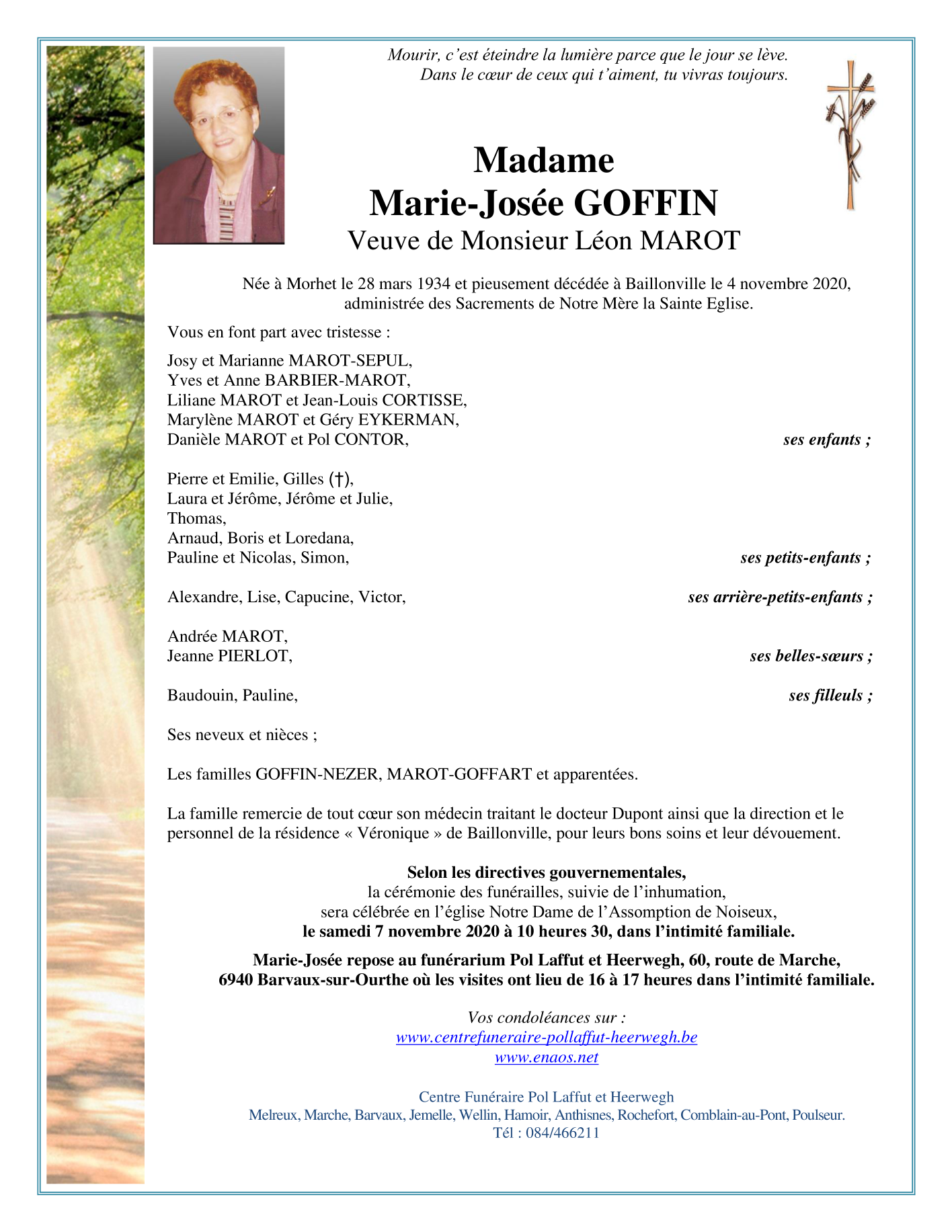 Décédée à Baillonville (5377) le mercredi 4 novembre 2020 à l'âge de 86 ans