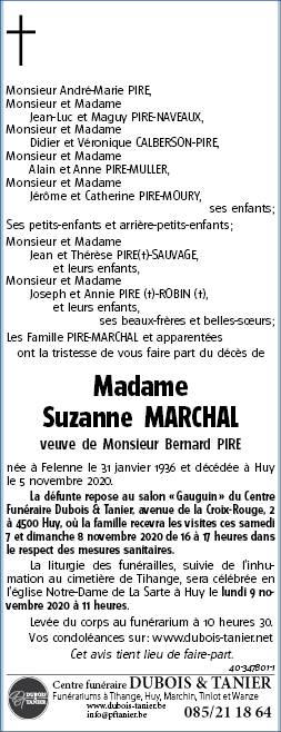 Décédée à Huy (4500) le jeudi 5 novembre 2020 à l'âge de 84 ans