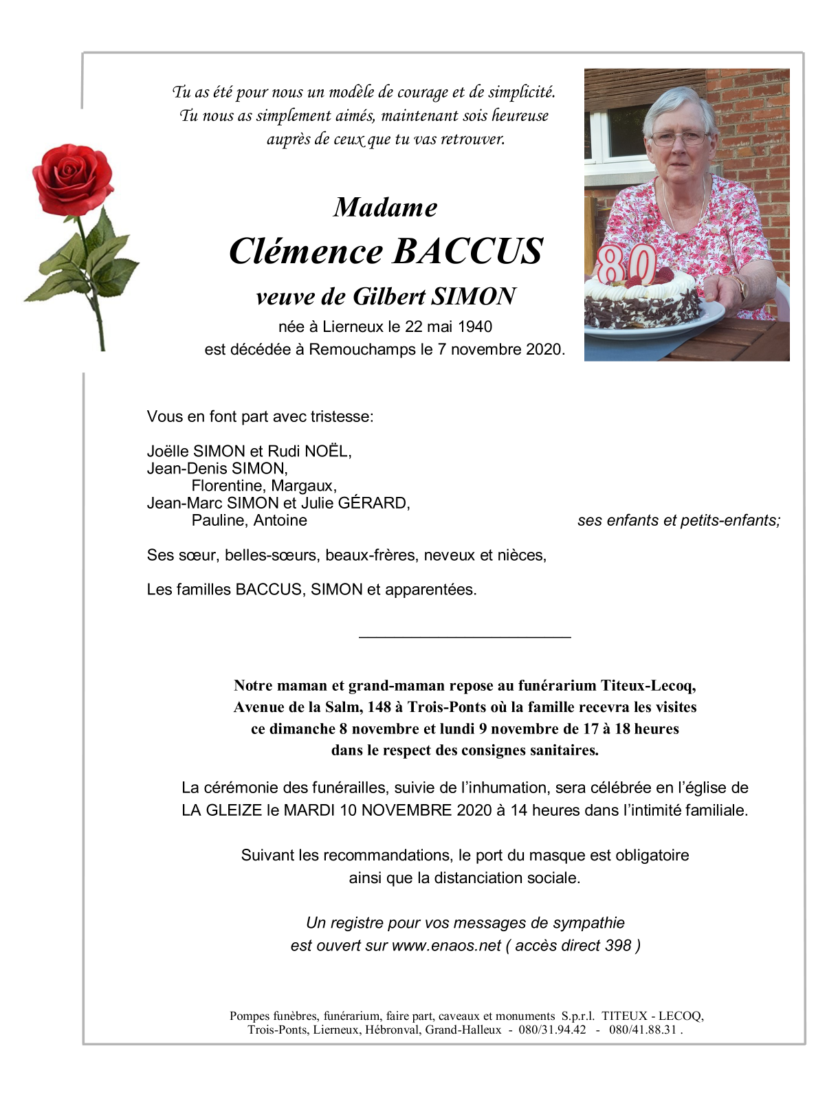 Décédée à Remouchamps (4920) le samedi 7 novembre 2020 à l'âge de 80 ans