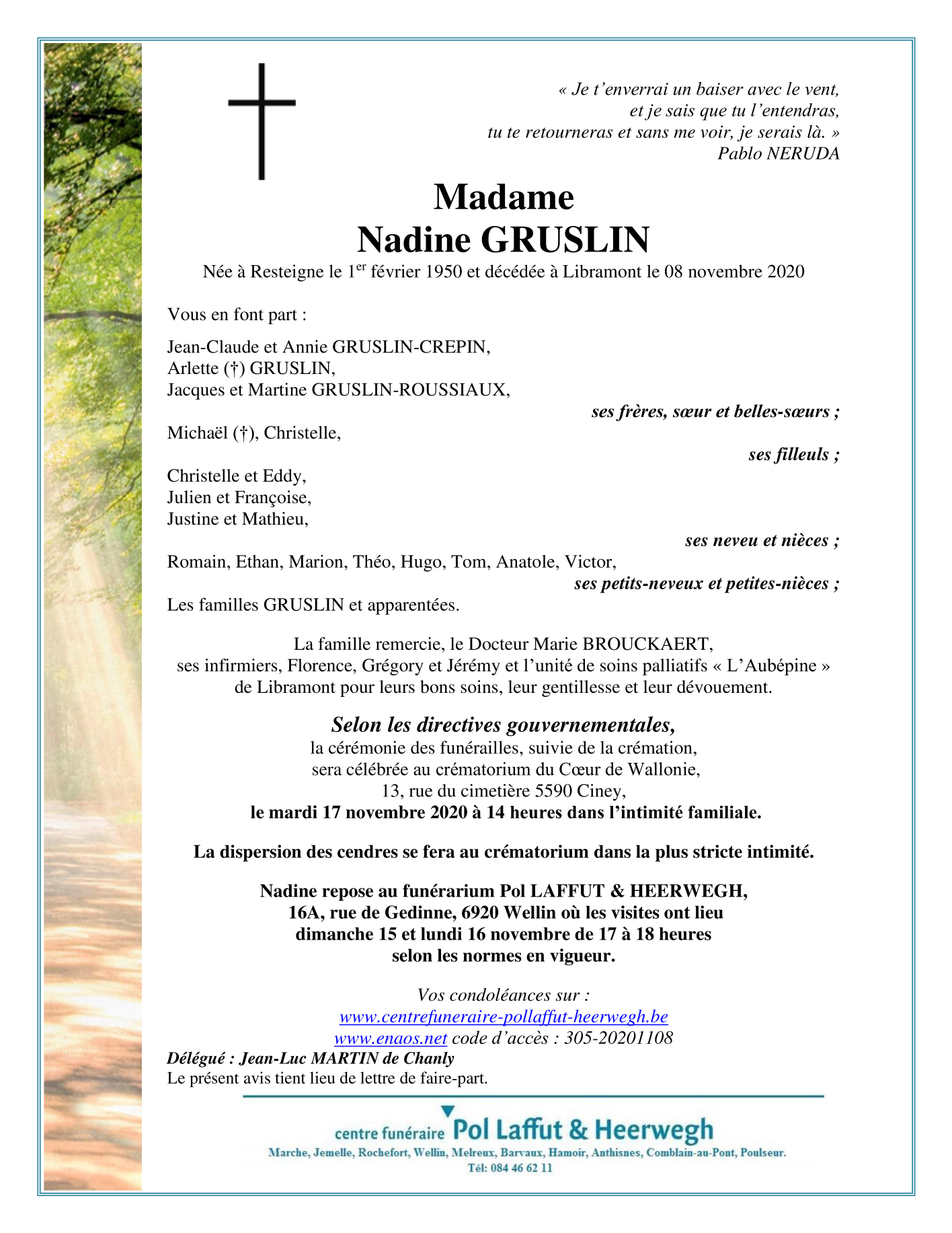 Décédée à Libramont-Chevigny (6800) le dimanche 8 novembre 2020 à l'âge de 70 ans