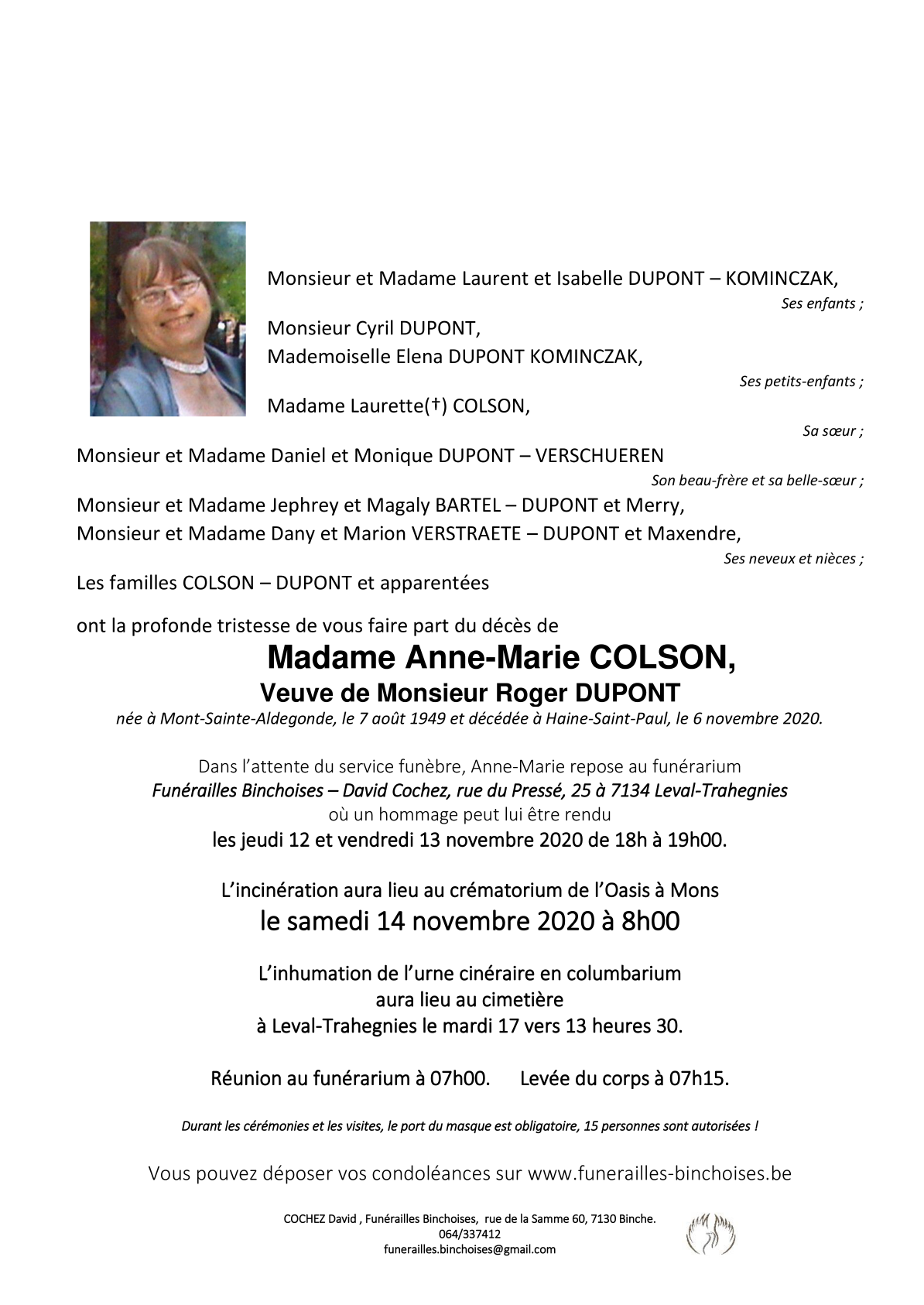 Décédée à La Louvière (7100) le vendredi 6 novembre 2020 à l'âge de 71 ans