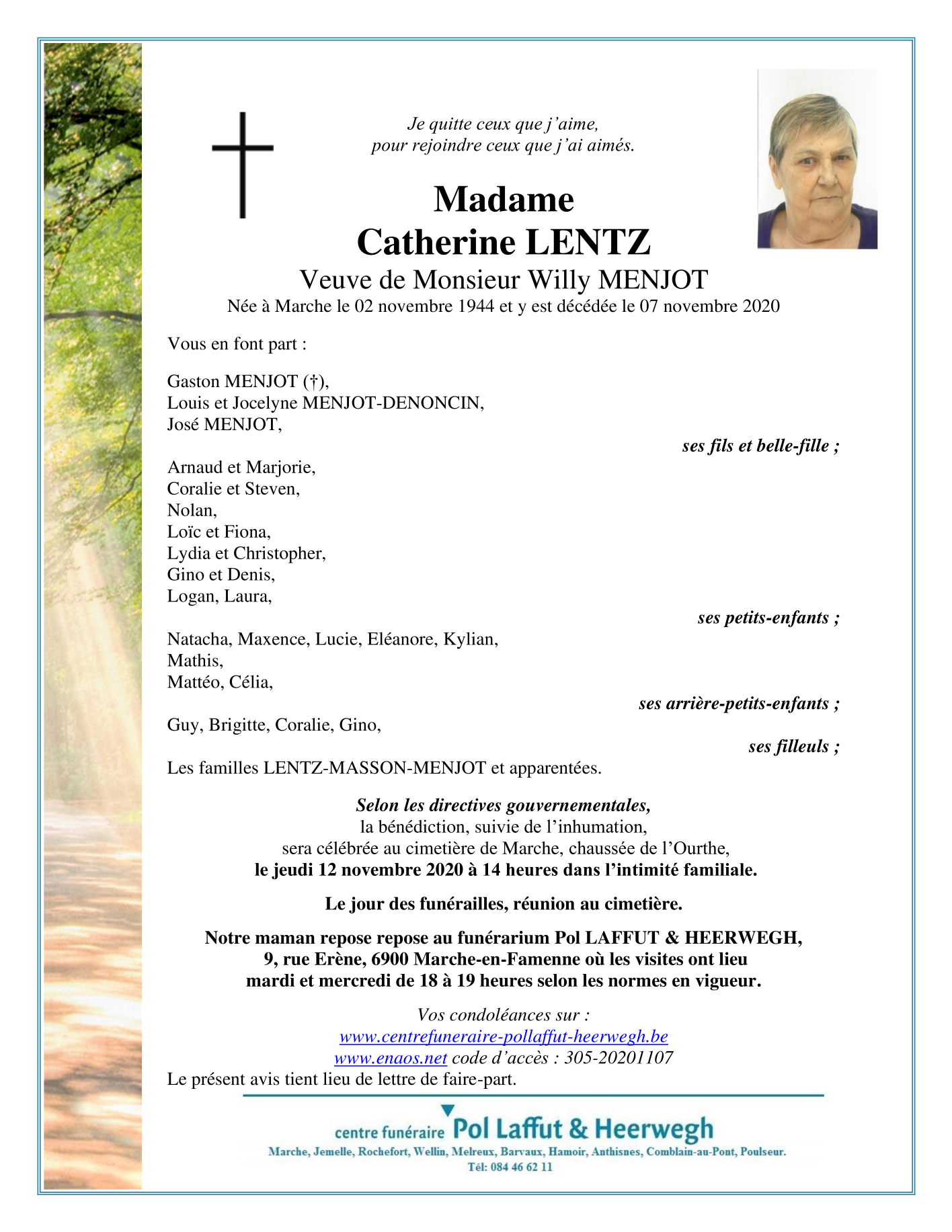 Décédée à Marche-en-Famenne (6900) le samedi 7 novembre 2020 à l'âge de 76 ans