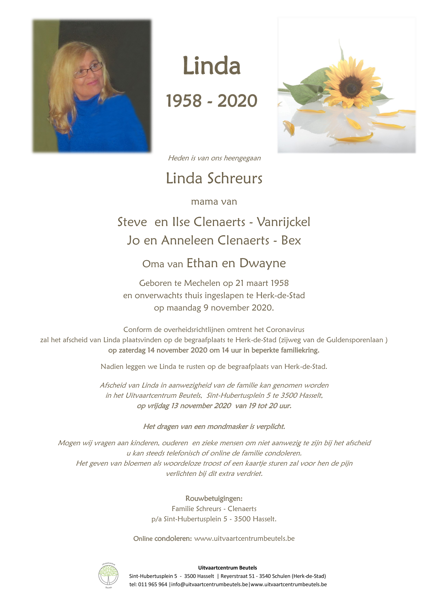 Décédée à Herk-de-Stad (3540) le lundi 9 novembre 2020 à l'âge de 62 ans