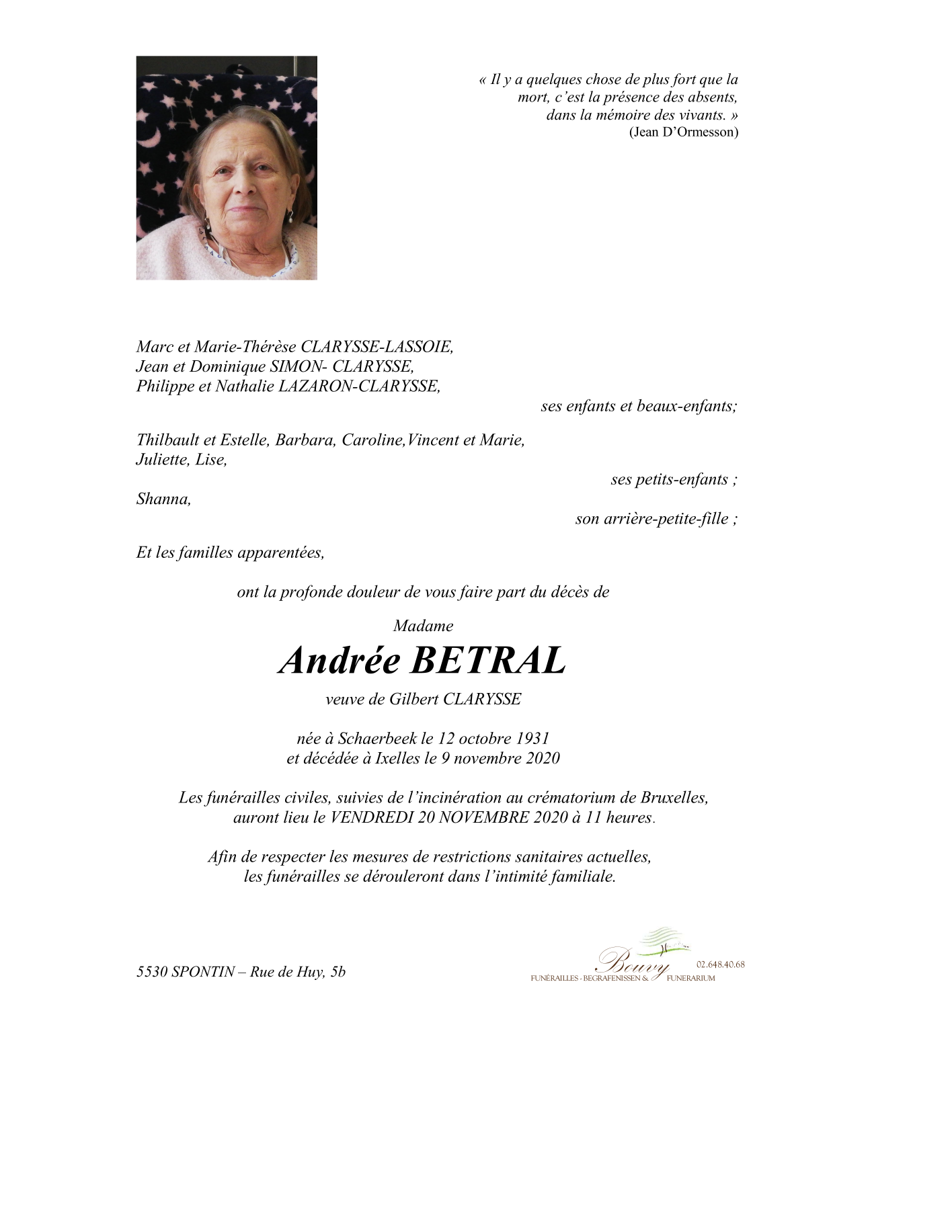 Décédée à Ixelles (1050) le lundi 9 novembre 2020 à l'âge de 89 ans