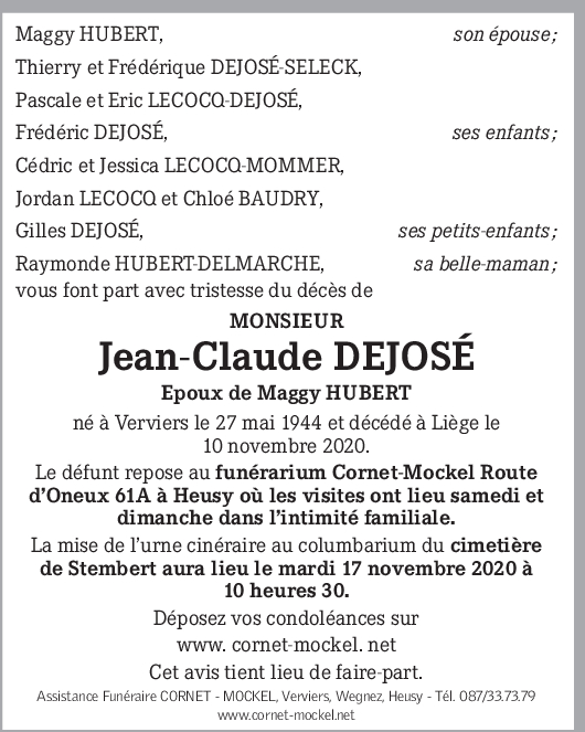 Décédé à Liège (4000) le mardi 10 novembre 2020 à l'âge de 76 ans