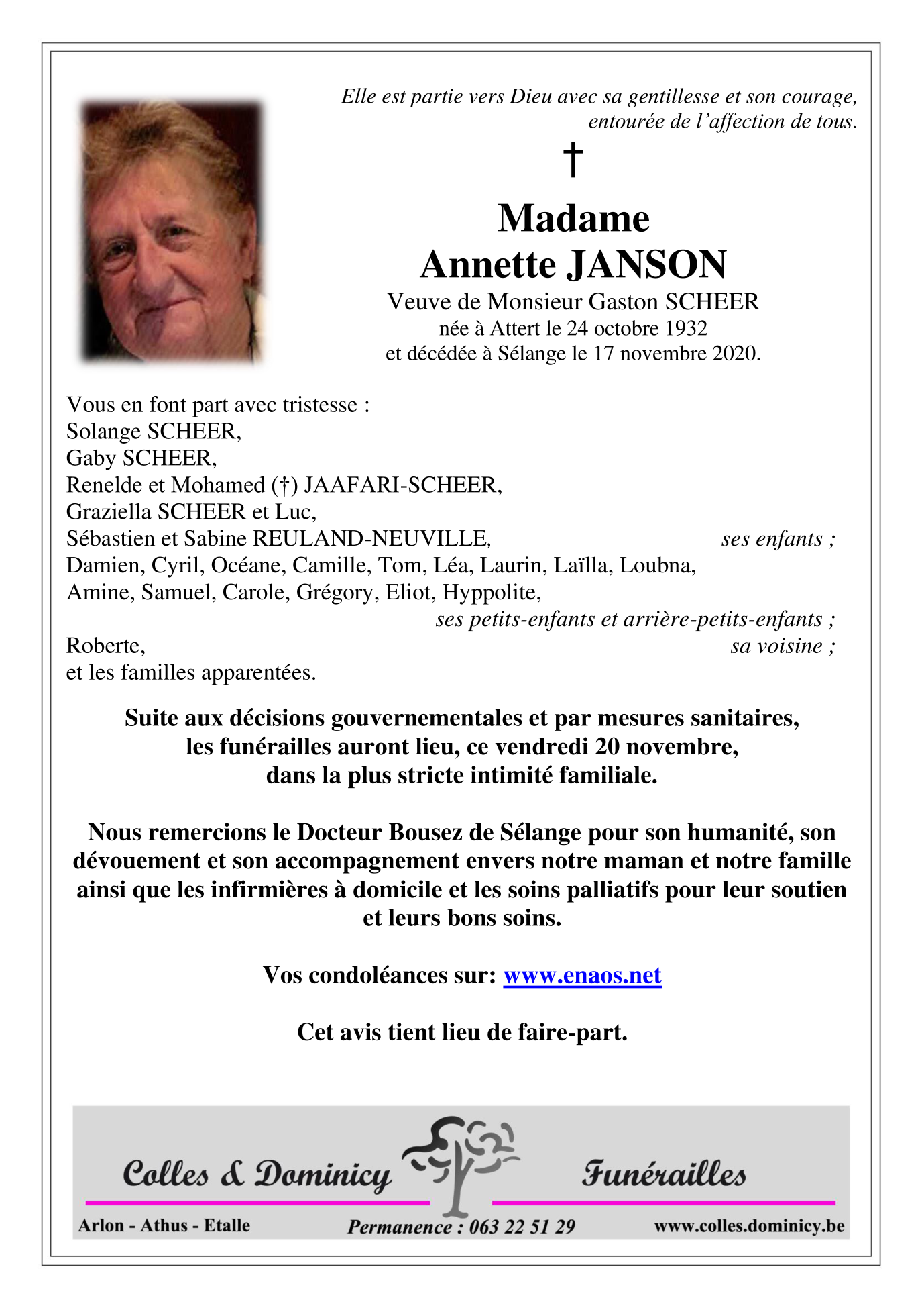 Décédée à Sélange (6781) le mardi 17 novembre 2020 à l'âge de 88 ans
