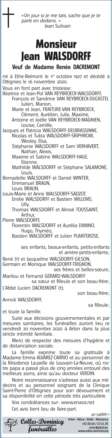 Overleden te Ottignies (1340) op maandag 16 november 2020 op 93-jarige leeftijd