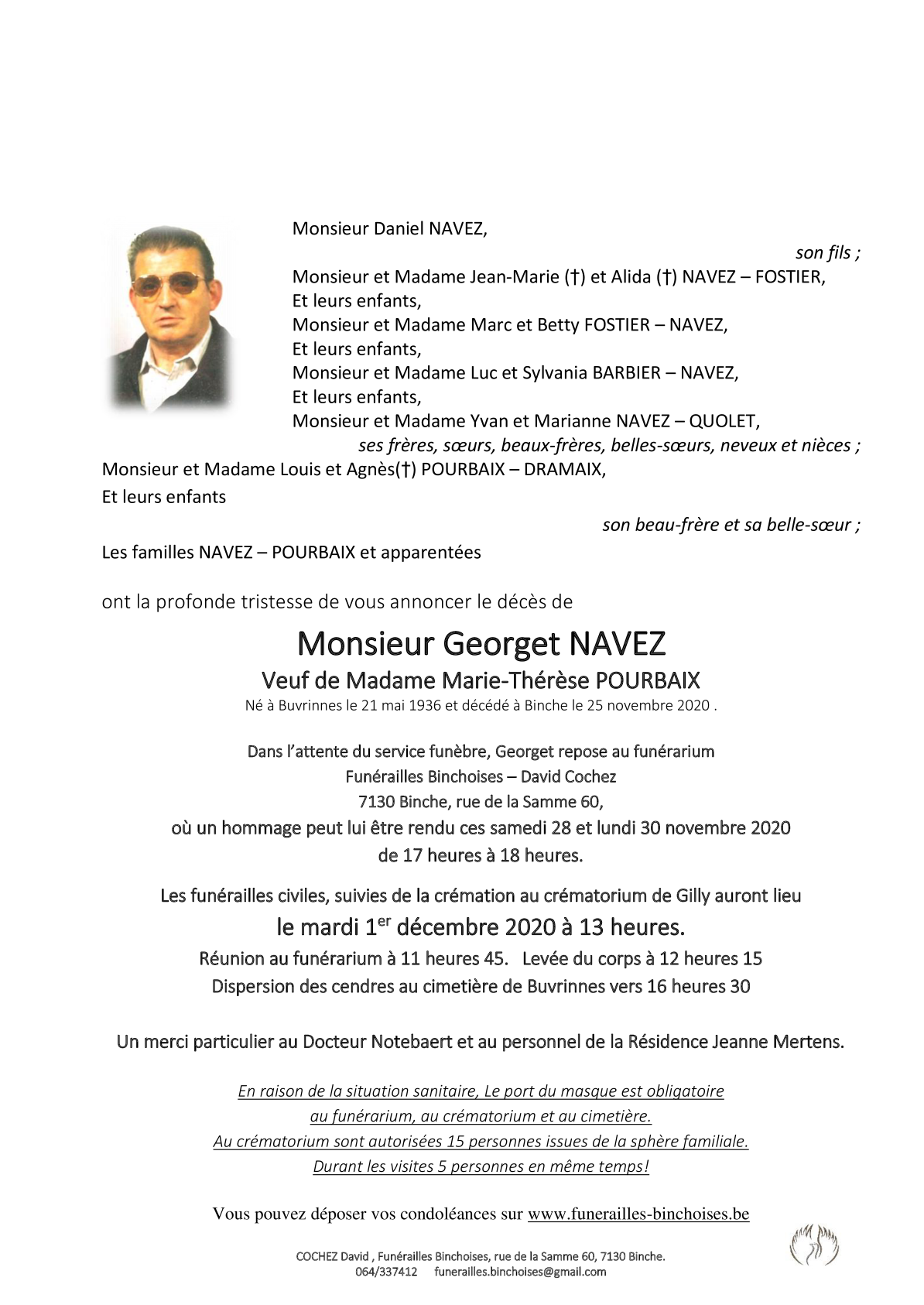 Décédé à Binche (7130) le mercredi 25 novembre 2020 à l'âge de 84 ans
