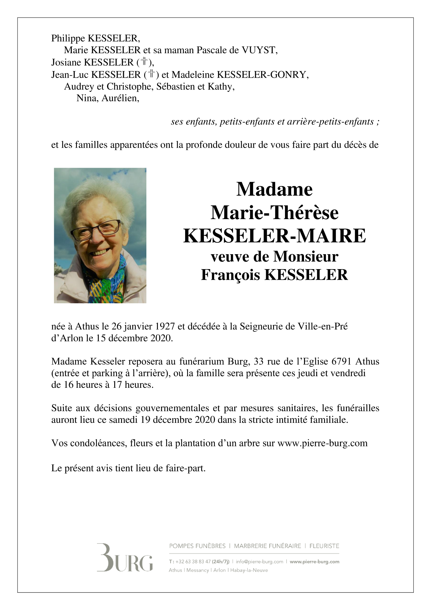 Décédée à Arlon (6700) le mardi 15 décembre 2020 à l'âge de 93 ans