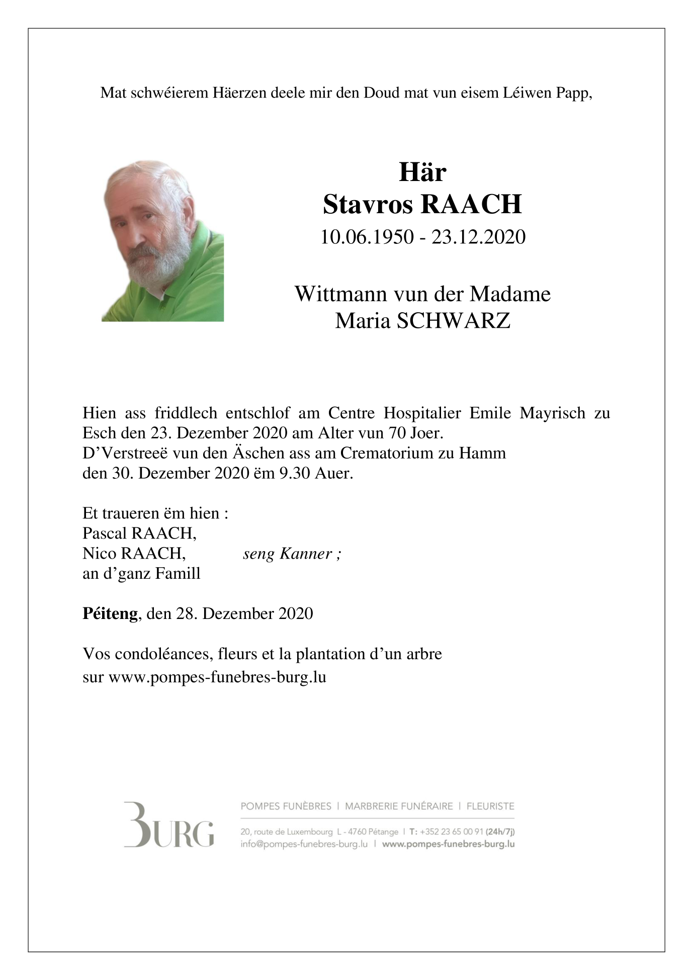 Décédé à Esch-Sur-Alzette/Mayrisch  (4240, Luxembourg) le mercredi 23 décembre 2020 à l'âge de 70 ans