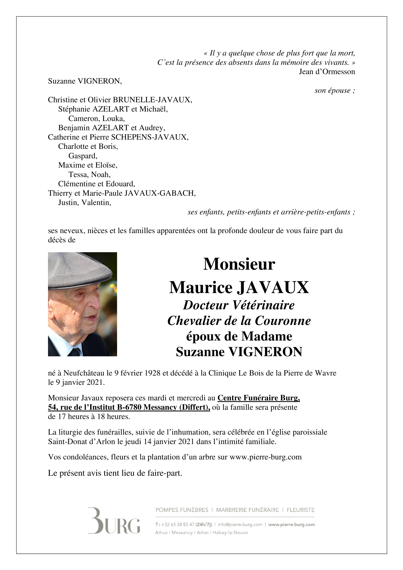 Décédé à Wavre (1300) le samedi 9 janvier 2021 à l'âge de 92 ans
