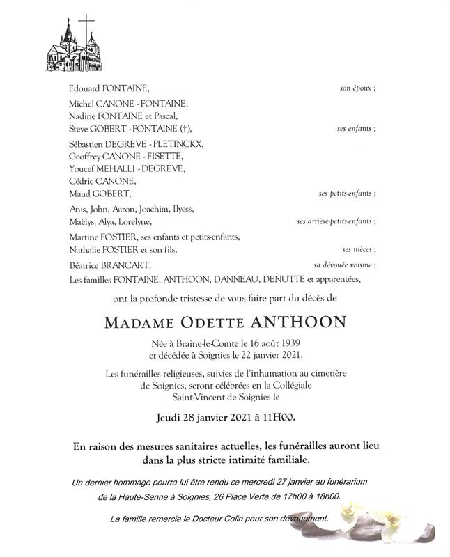 Décédée à Soignies (7060) le vendredi 22 janvier 2021 à l'âge de 81 ans
