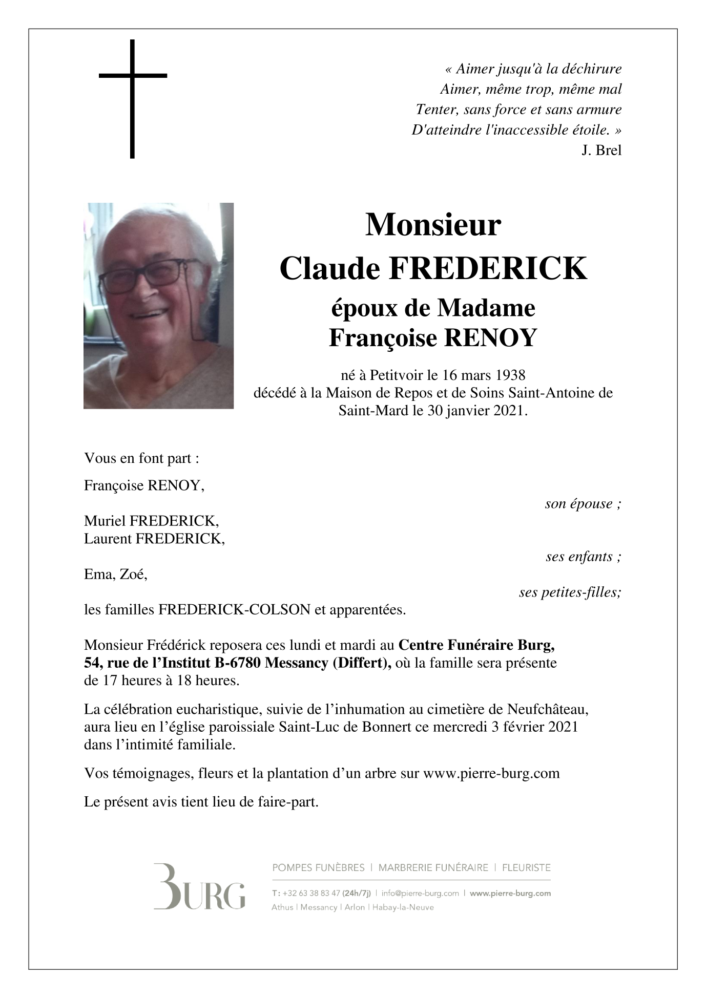 Fallecido en Saint-Mard (6762) el sábado, 30 de enero de 2021 a la edad de 82 años