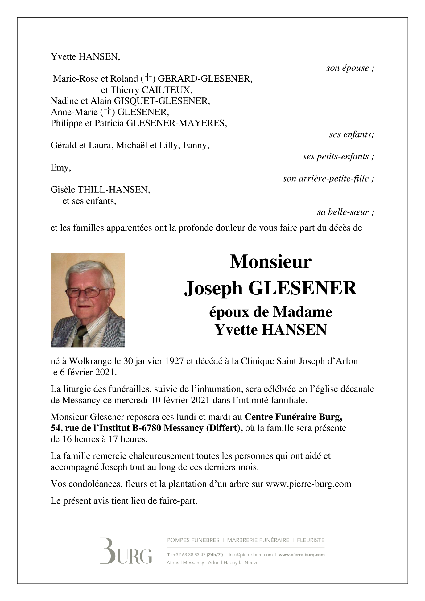 Décédé à Arlon (6700) le samedi 6 février 2021 à l'âge de 94 ans