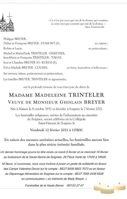 Décédée à Soignies (7060) le dimanche 7 février 2021 à l'âge de 88 ans