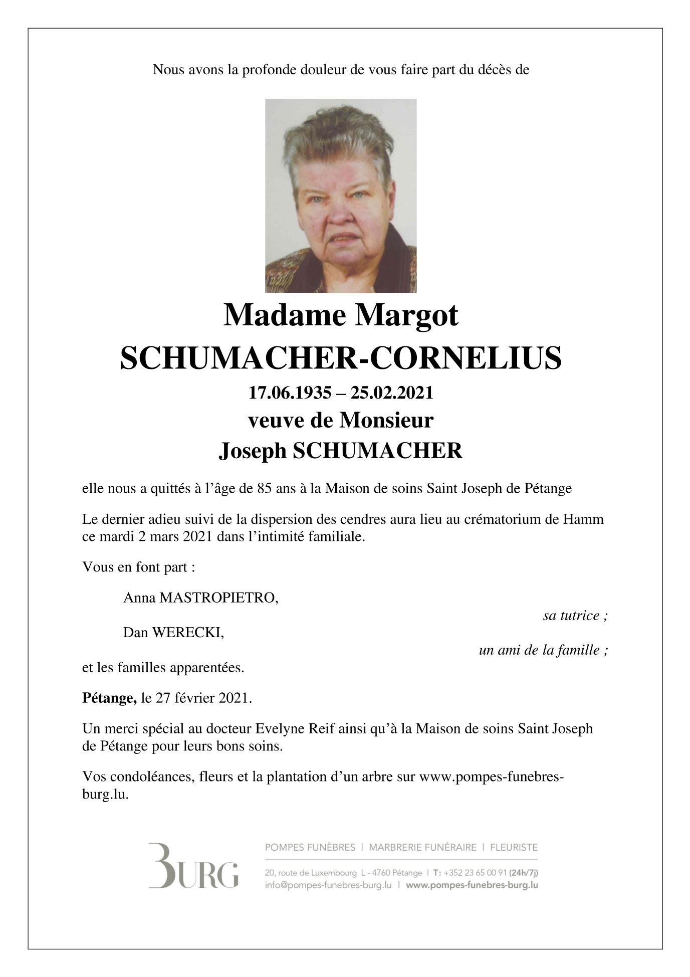 Décédée à Petange/Eglise  (4732, Luxembourg) le jeudi 25 février 2021 à l'âge de 85 ans
