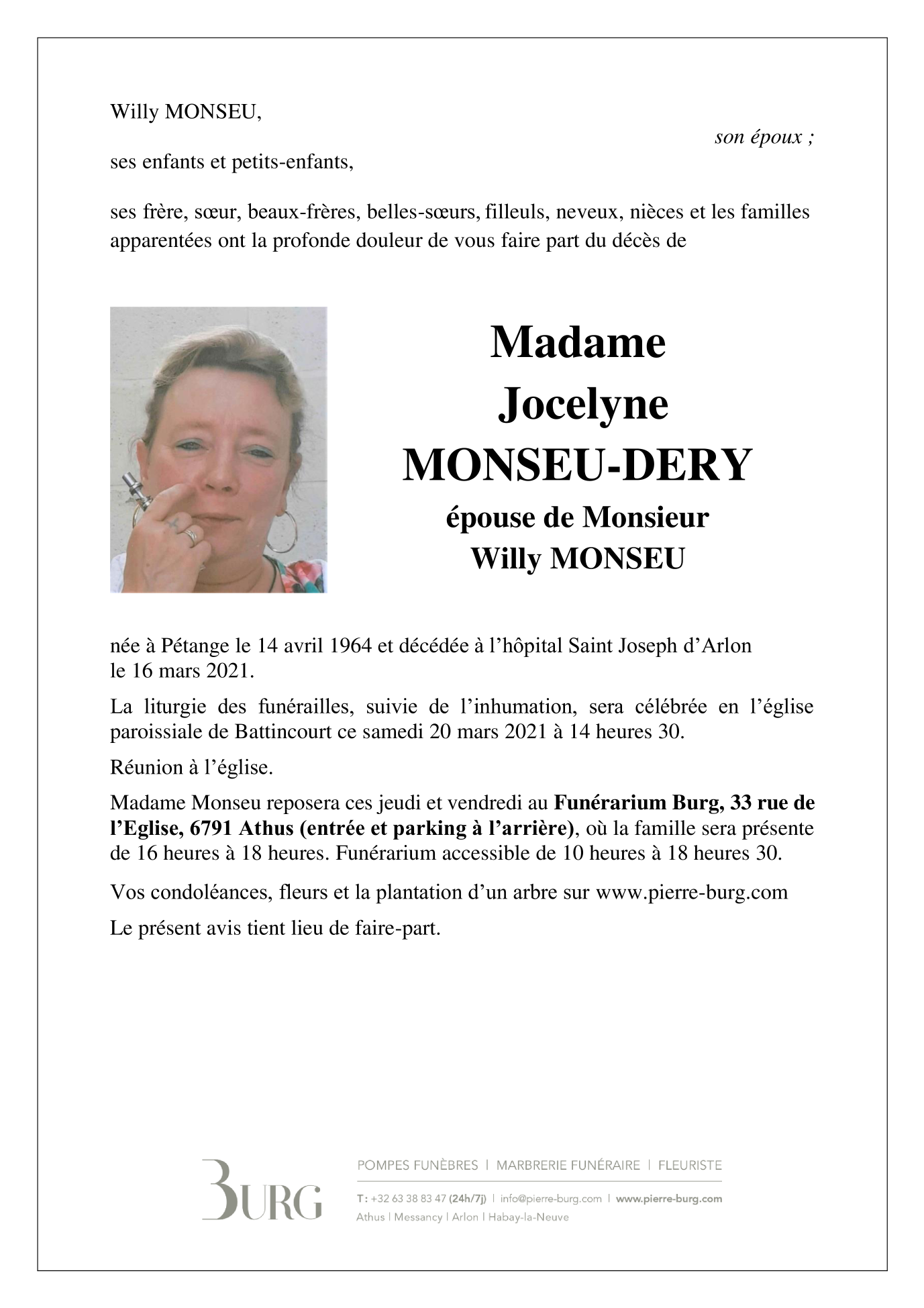 Décédée à Arlon (6700) le mardi 16 mars 2021 à l'âge de 56 ans