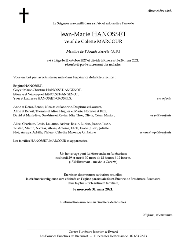 Décédé à Rixensart (1330) le vendredi 26 mars 2021 à l'âge de 93 ans