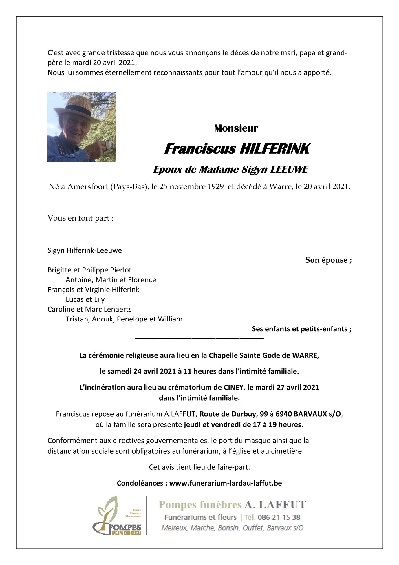 Décédé à Warre (6941) le mardi 20 avril 2021 à l'âge de 91 ans