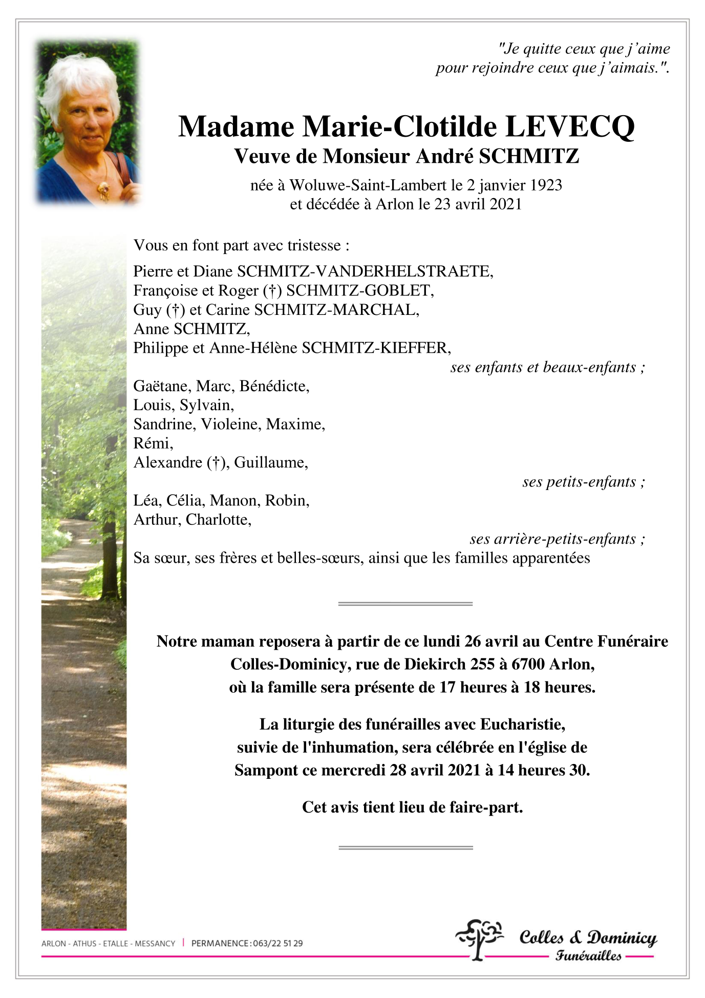 Fallecida en Arlon (6700) el viernes, 23 de abril de 2021 a la edad de 98 años