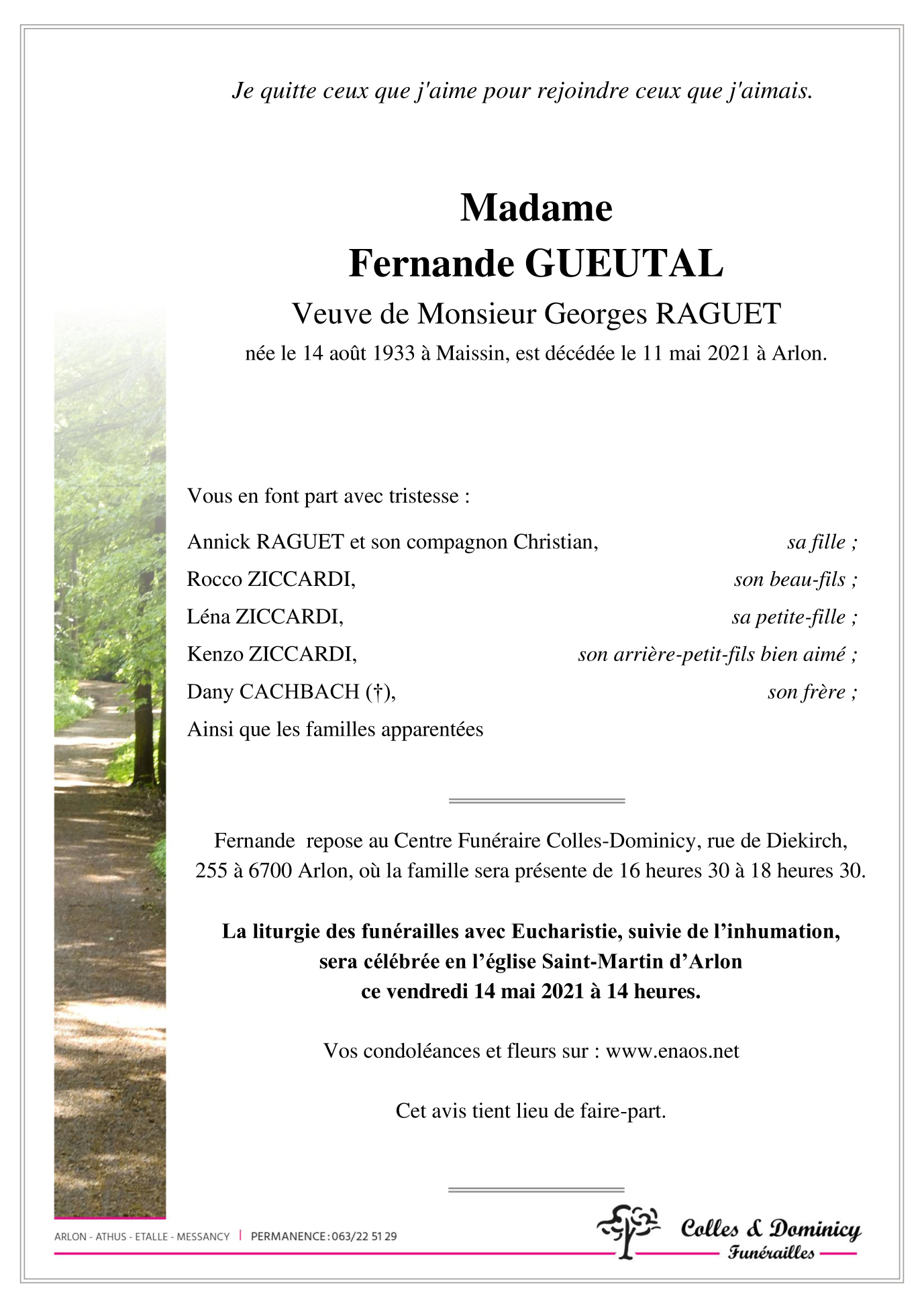 Décédée à Arlon (6700) le mardi 11 mai 2021 à l'âge de 87 ans