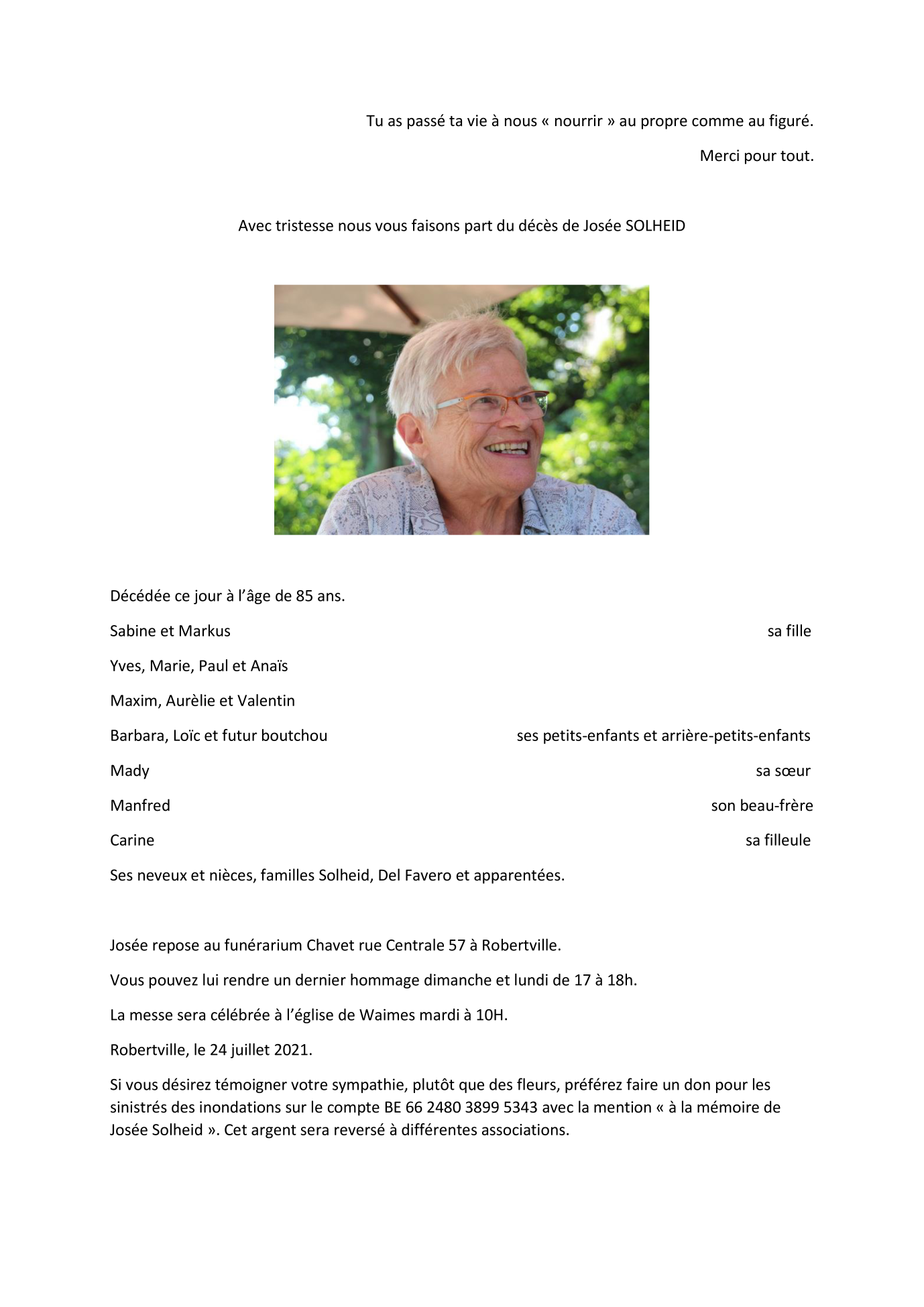 Décédée à Robertville (4950) le samedi 24 juillet 2021 à l'âge de 85 ans