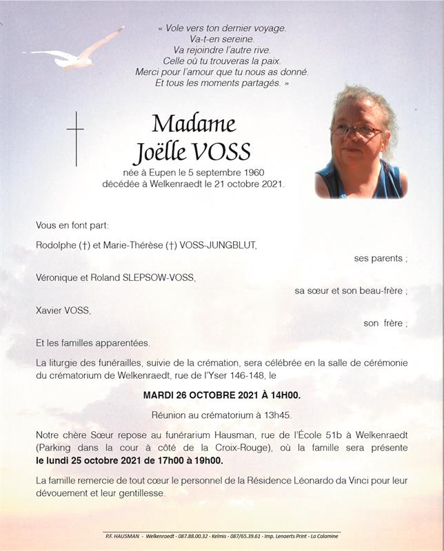 Décédée à Welkenraedt (4840) le jeudi 21 octobre 2021 à l'âge de 61 ans