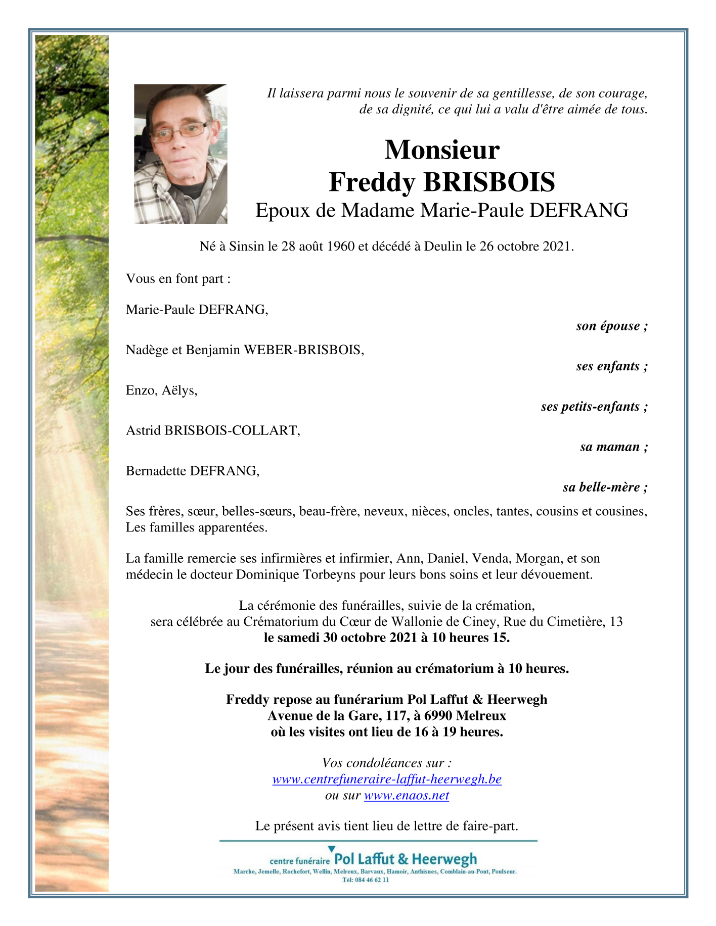Fallecido en Deulin (6990) el martes, 26 de octubre de 2021 a la edad de 61 años