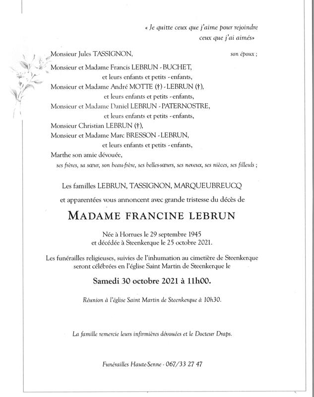 Décédée à Steenkerque (7090) le lundi 25 octobre 2021 à l'âge de 76 ans