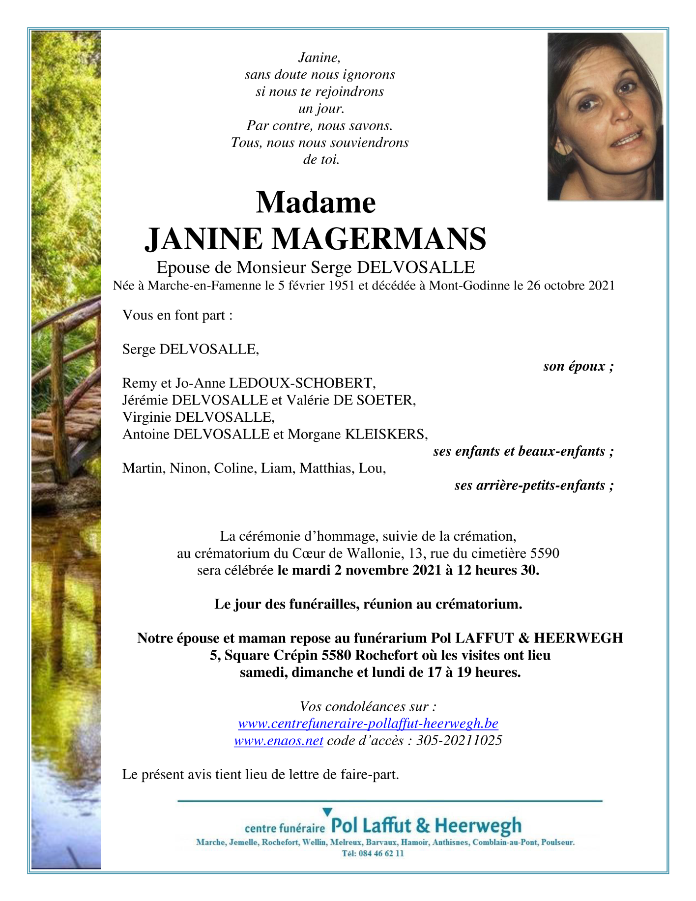 Décédée à Yvoir (5530) le mardi 26 octobre 2021 à l'âge de 70 ans