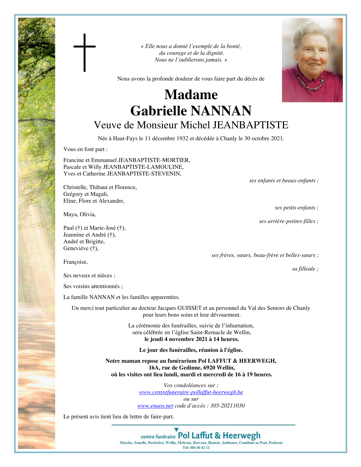 Décédée à Chanly (6921) le samedi 30 octobre 2021 à l'âge de 88 ans
