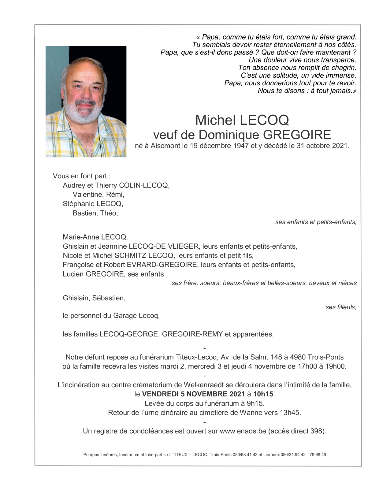Décédé à Aisomont (4980) le dimanche 31 octobre 2021 à l'âge de 73 ans