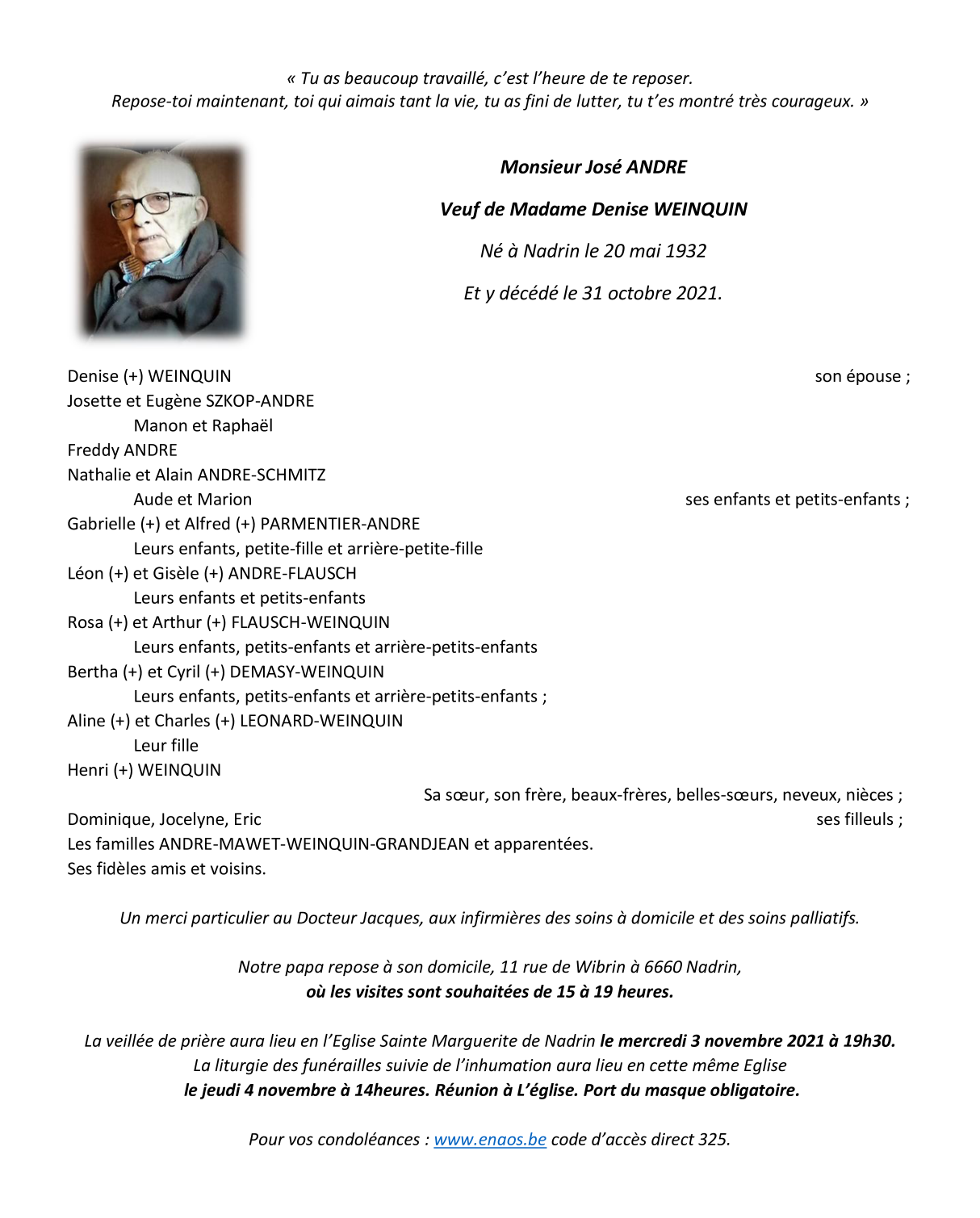 Décédé à Nadrin (6660) le dimanche 31 octobre 2021 à l'âge de 89 ans