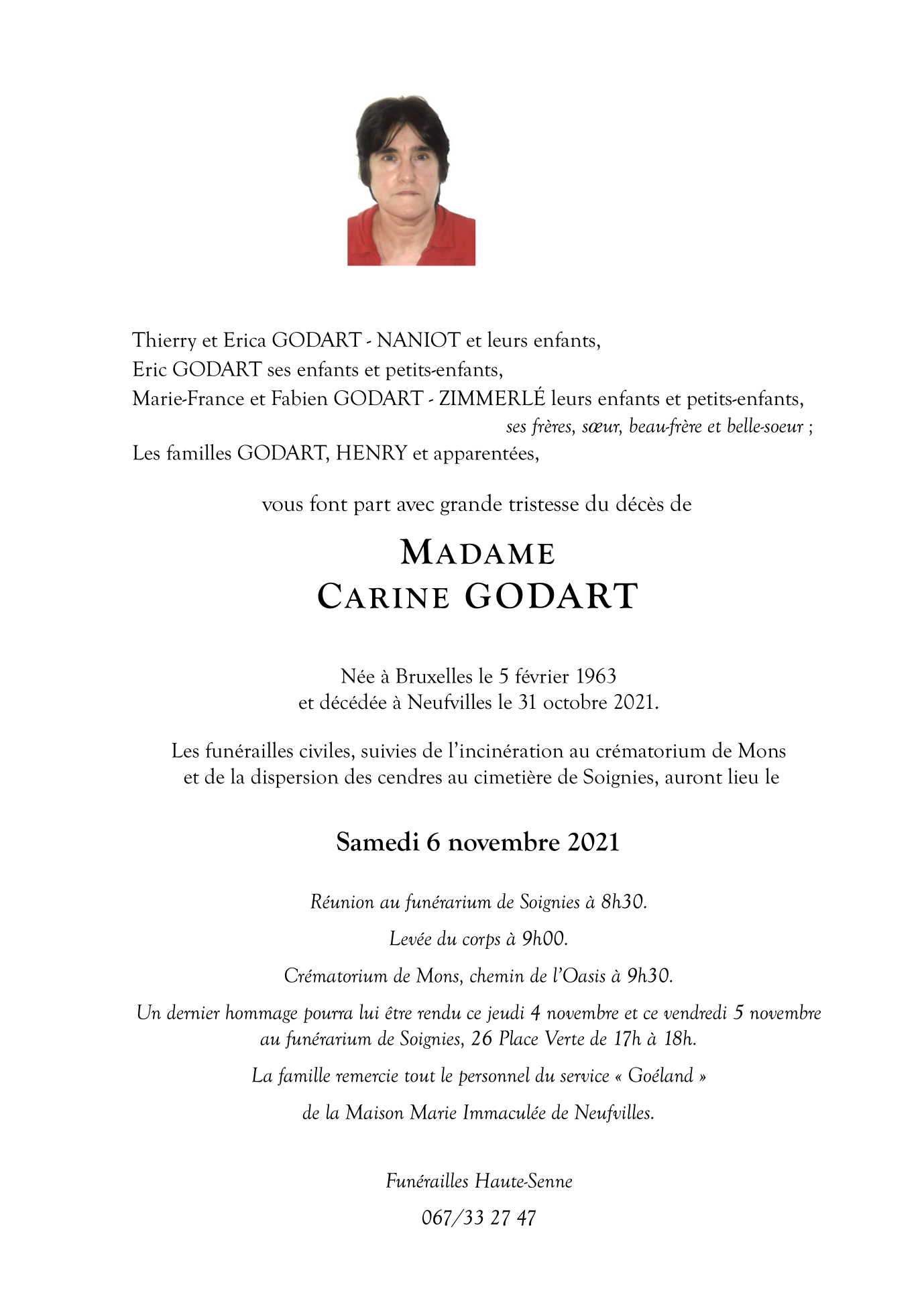 Décédée à Neufvilles (7063) le dimanche 31 octobre 2021 à l'âge de 58 ans