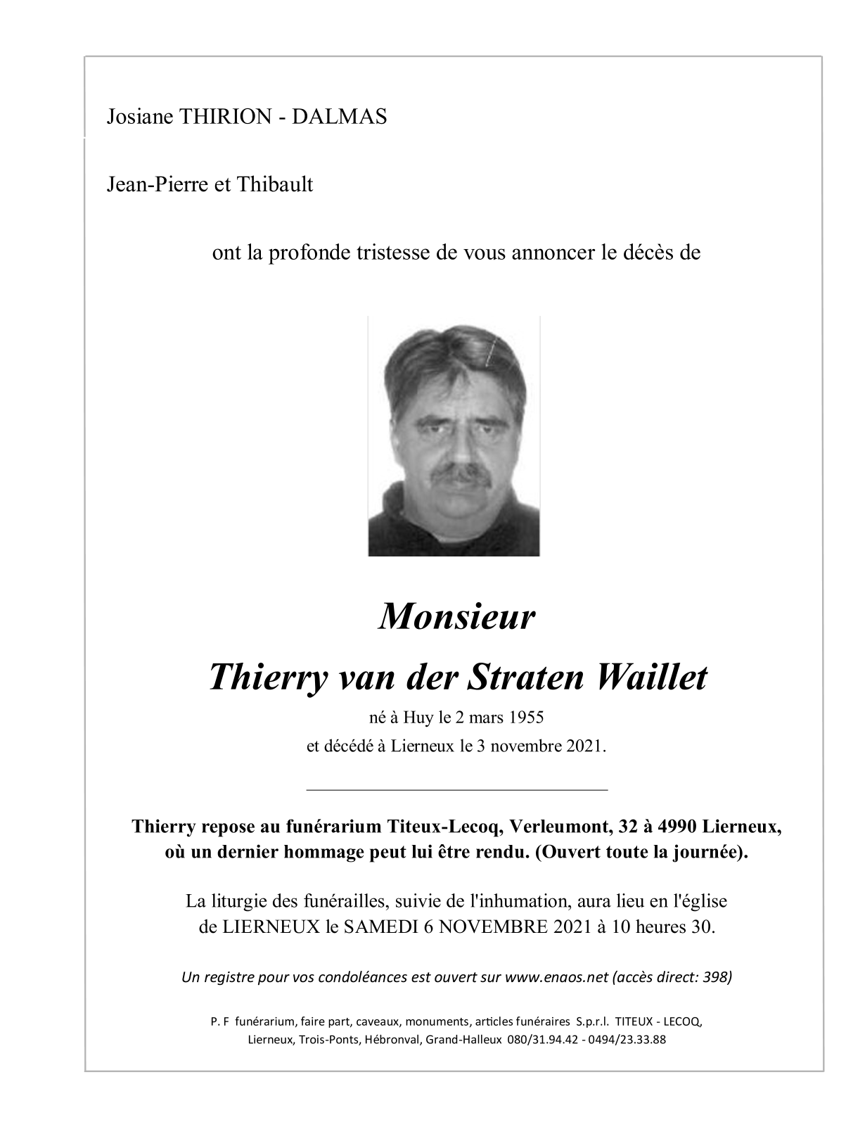 Décédé à Lierneux (4990) le mercredi 3 novembre 2021 à l'âge de 66 ans