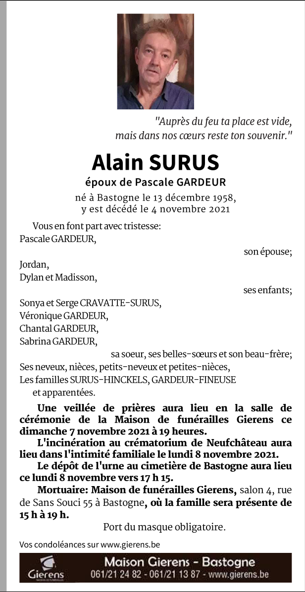 Décédé à Bastogne (6600) le jeudi 4 novembre 2021 à l'âge de 62 ans
