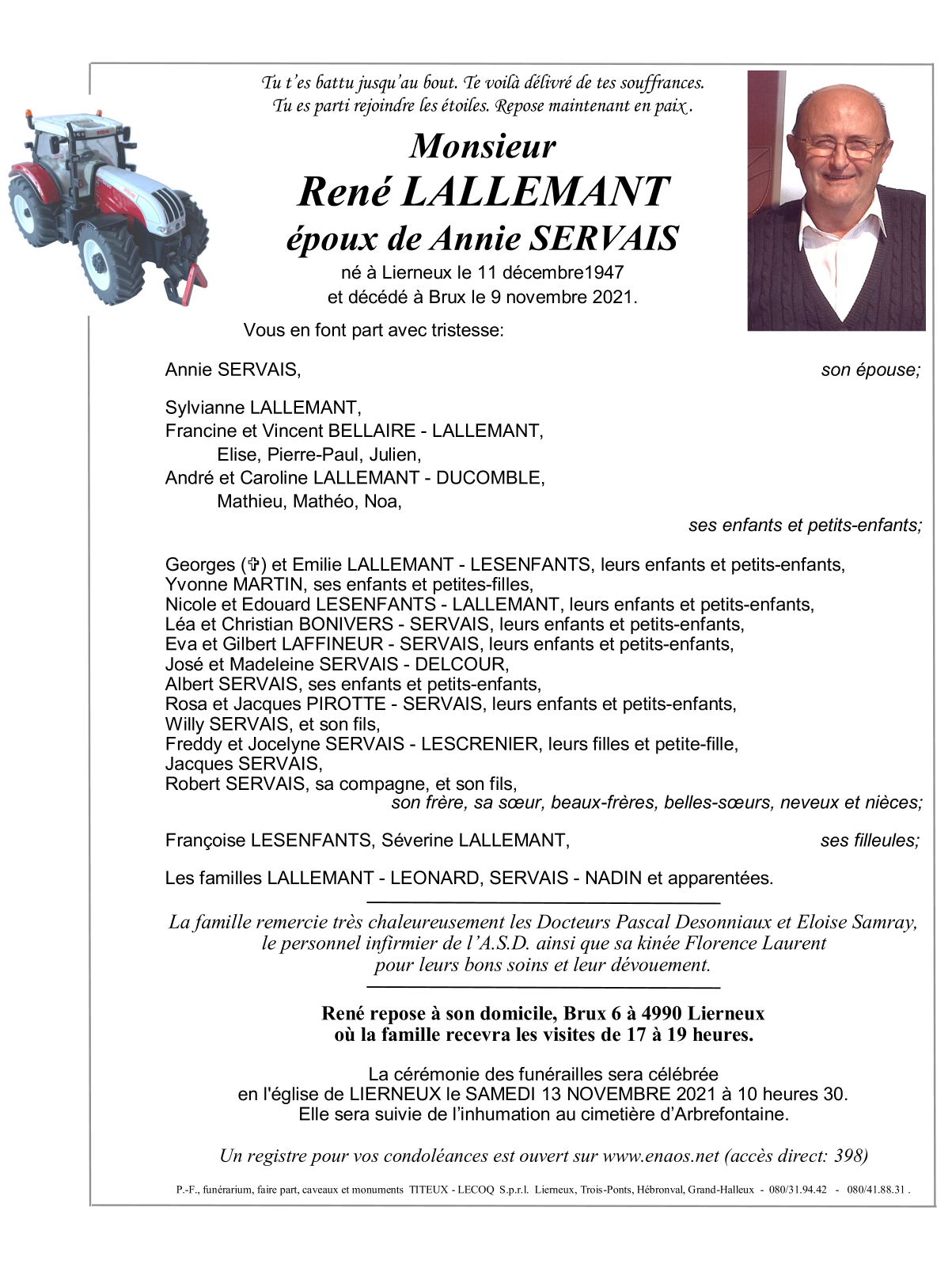 Décédé à Lierneux (4990) le mardi 9 novembre 2021 à l'âge de 73 ans